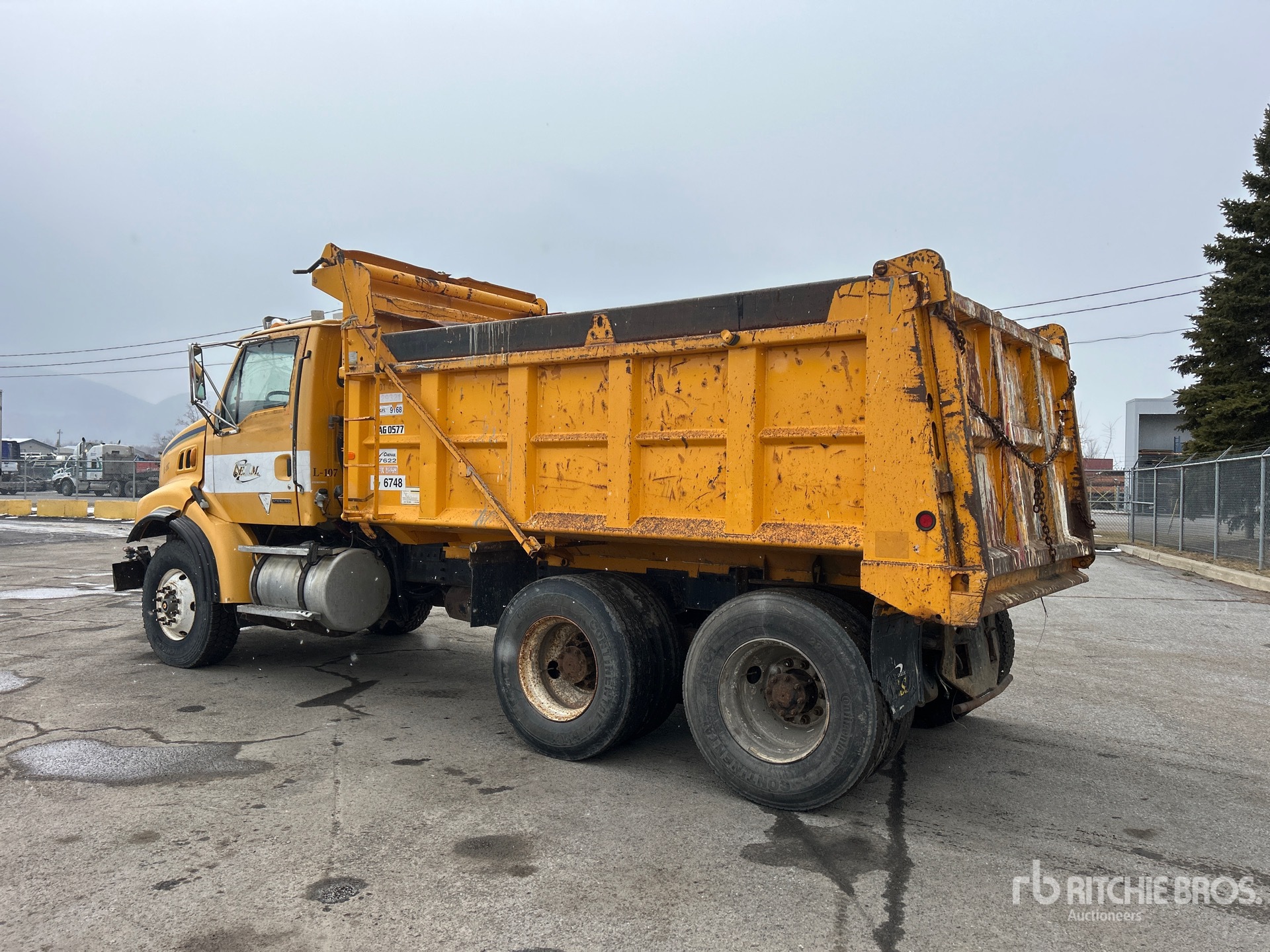 Cat C10 Diesel Engine, 18417 Engine hrs, Eaton Fuller 15-Speed Transmission, 20000 lb Front Axle, 46000 lb Rears, 66000 lb GVWR, Spring Suspension, 192 in Wheelbase, PTO, Hydraulic System, 14 ft Long x 42 in High Steel Body, Manual Roll Tarp
