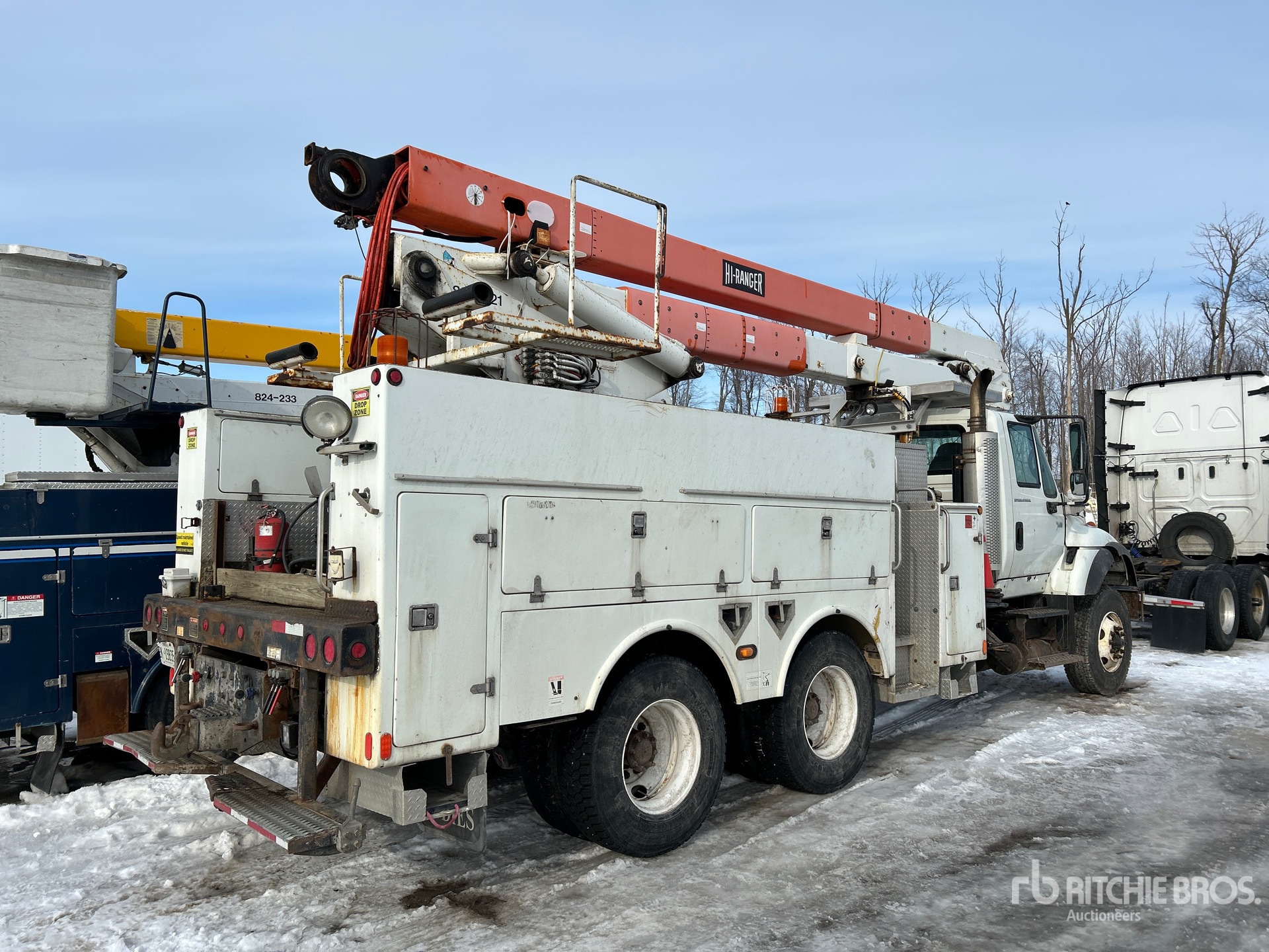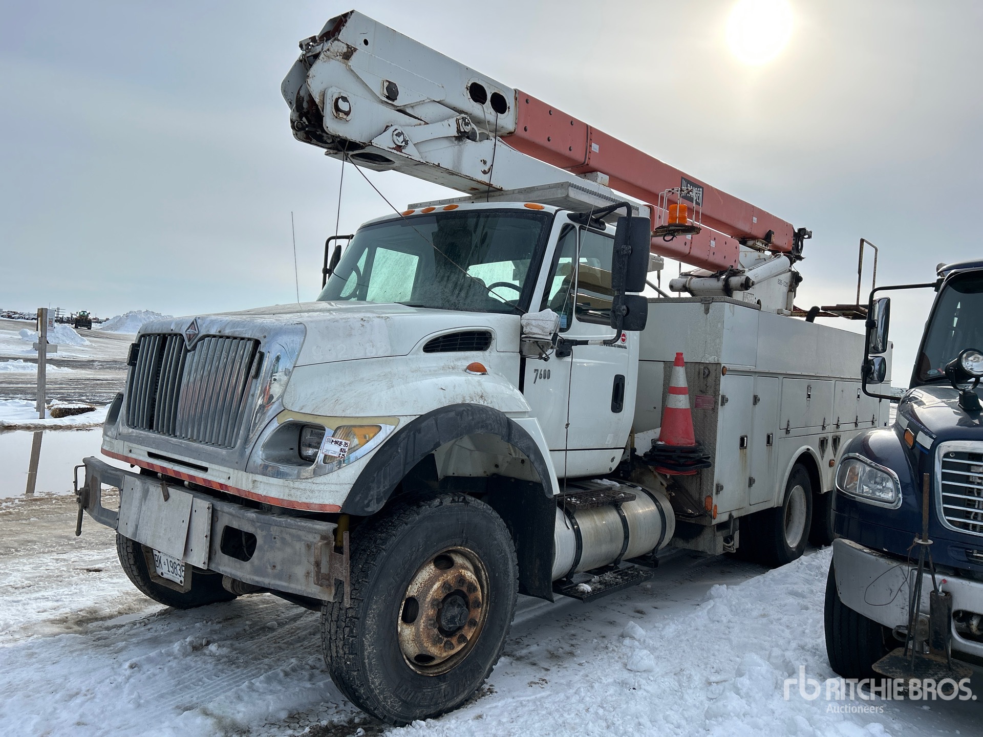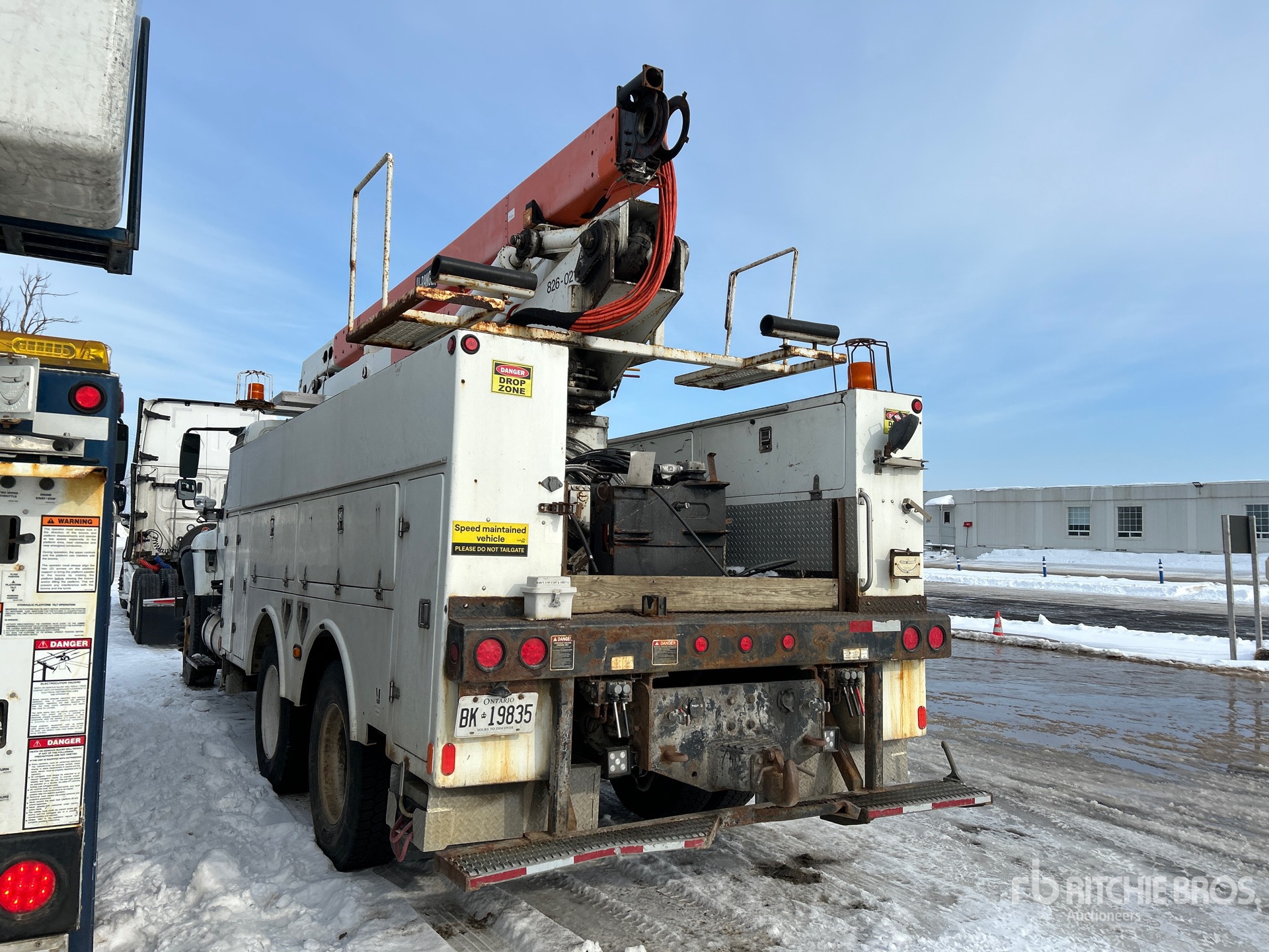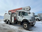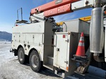 Diesel Engine, 6875 Engine hrs, Eaton Fuller Manual Transmission, Differential Lock, 10433 lb Front Axle, 46000 lb Rears, 62000 lb GVWR, Steel, 12R22.5 Front Tires, 11R22.5 Rear Tires, Dual Steering Boxes, Spring Suspension, 217 in Wheelbase, PTO, 600 lb Capacity, Rear Mounted, Insulated Articulated Boom, Utility Body, 17 ft 8 in x 102 in Bed