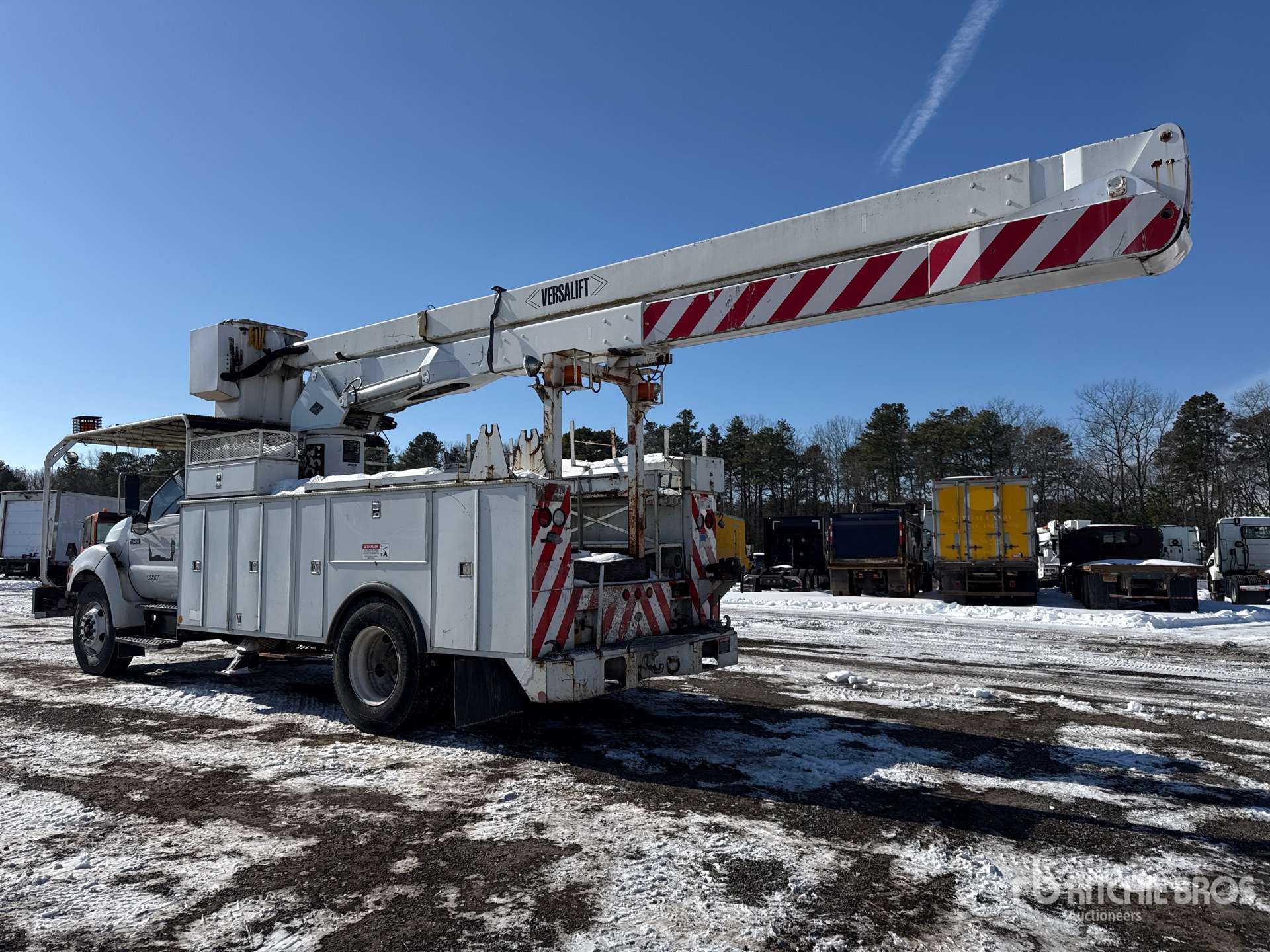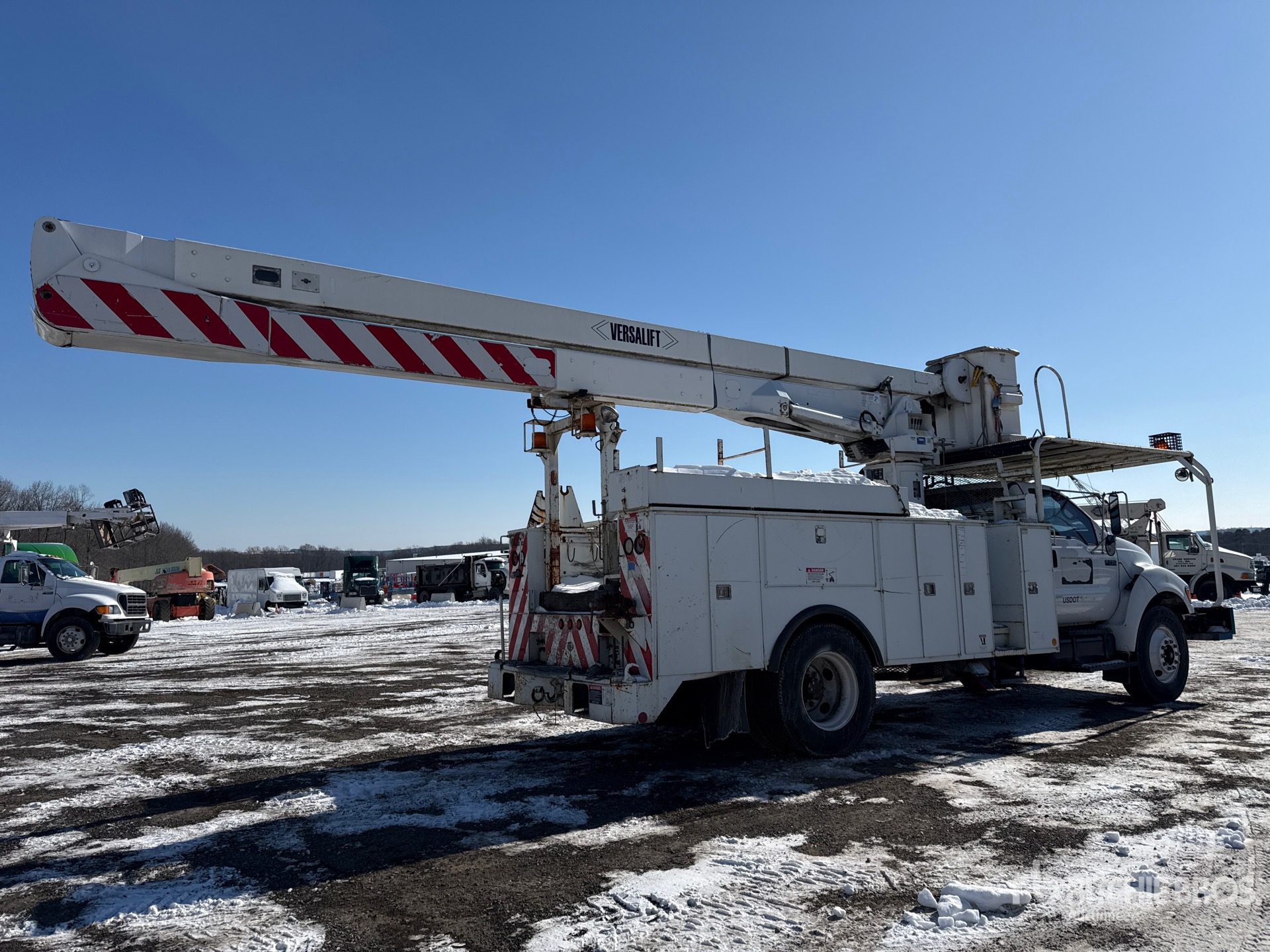 Cat 6 Cylinder 7.2 L Diesel Engine, 2003 US EPA Label, 05879.5 Engine hrs, 5-Speed Automatic Transmission, 12000 lb Front Axle, 21000 lb Rears, 33000 lb GVWR, Spring Suspension, 700 lb Capacity, Front Mounted, Insulated One-Person Articulated Boom, Lower Boom Fiberglass Insert, Utility Body, A-Outriggers, Bumper Mounted Winch, 16 ft 6 in x 96 in Bed, Pintle Hitch