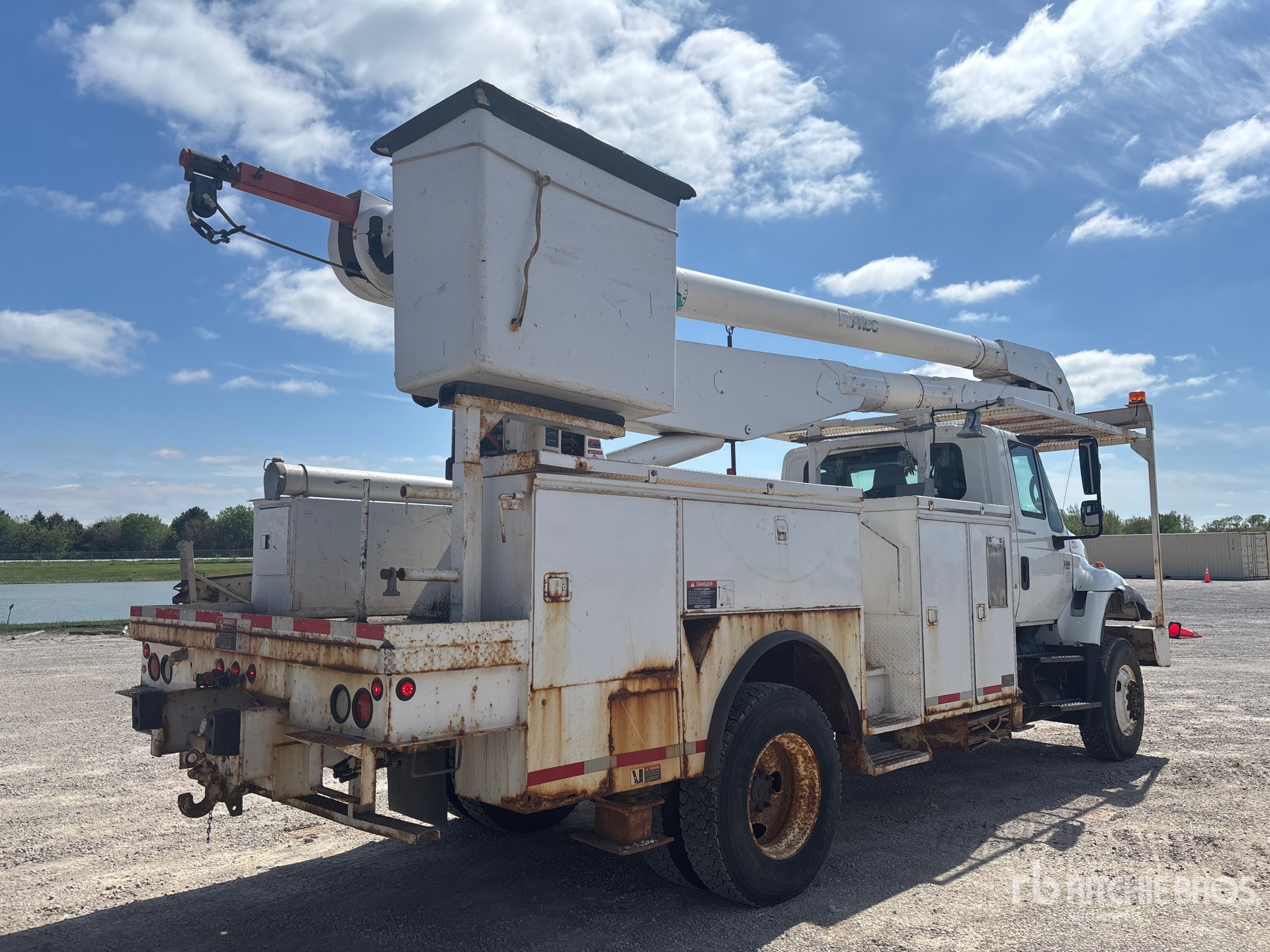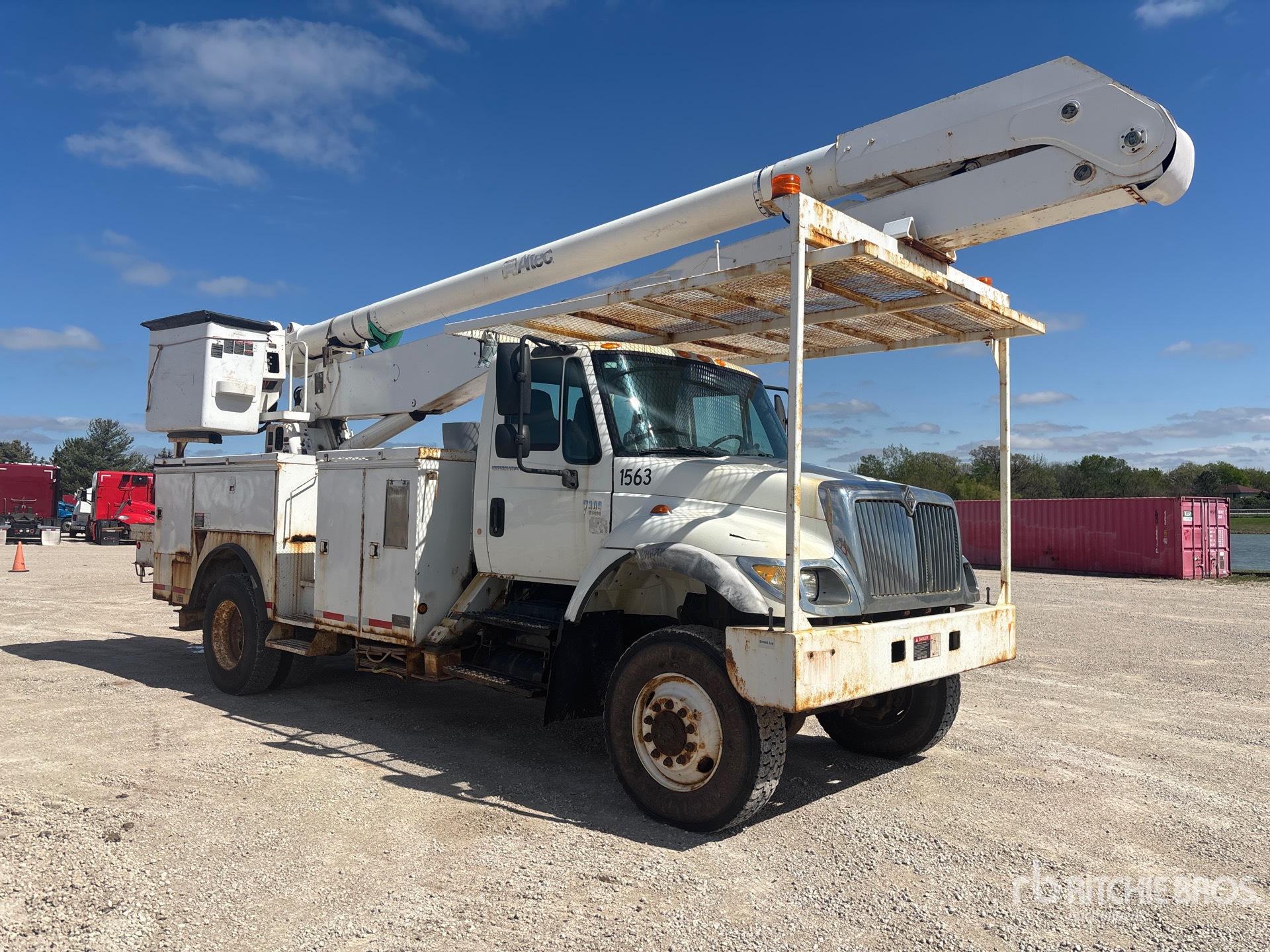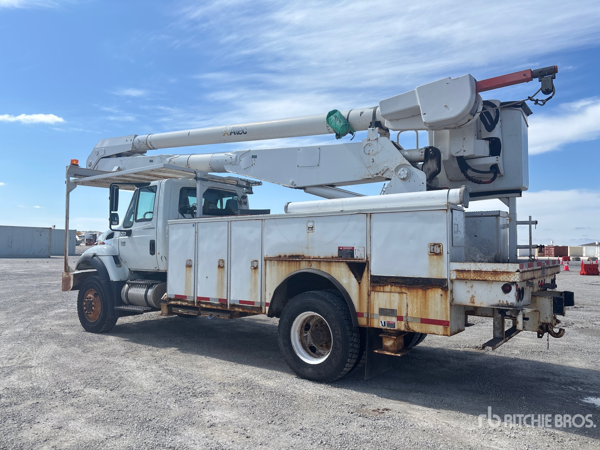 International DT466 6 Cylinder 7.6 L Diesel 245 hp Engine, 2005 US EPA Label, CARB Compliant, 16907 Engine hrs, Allison Automatic Transmission, 11R22.5, Spring Suspension, 195 in Wheelbase, PTO, 700 lb Capacity, Rear Mounted, Insulated Two-Person Articulated Boom, Utility Body, Boom Tip Mounted Winch, Material Handling Jib, Straight Down Outriggers, Rear Outriggers, 16 ft 3 in x 96 in Bed, Ringfeder