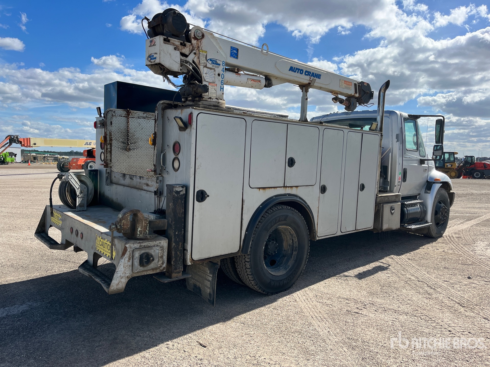 International 6 Cylinder Diesel Engine, 15640 Engine hrs, Eaton Fuller 6-Speed Manual Transmission, 8000 lb Front Axle, 17500 lb Rears, 25500 lb GVWR, 11R22.5, Spring Suspension, 188 in Wheelbase, 11 ft Body, Hydraulic Stabilizers, Auto Crane 8406H 8400 lb 3 Section Hydraulic Crane, Hydraulic Air Compressor, Lincoln 250GXT Ranger 250 A Gasoline Welder