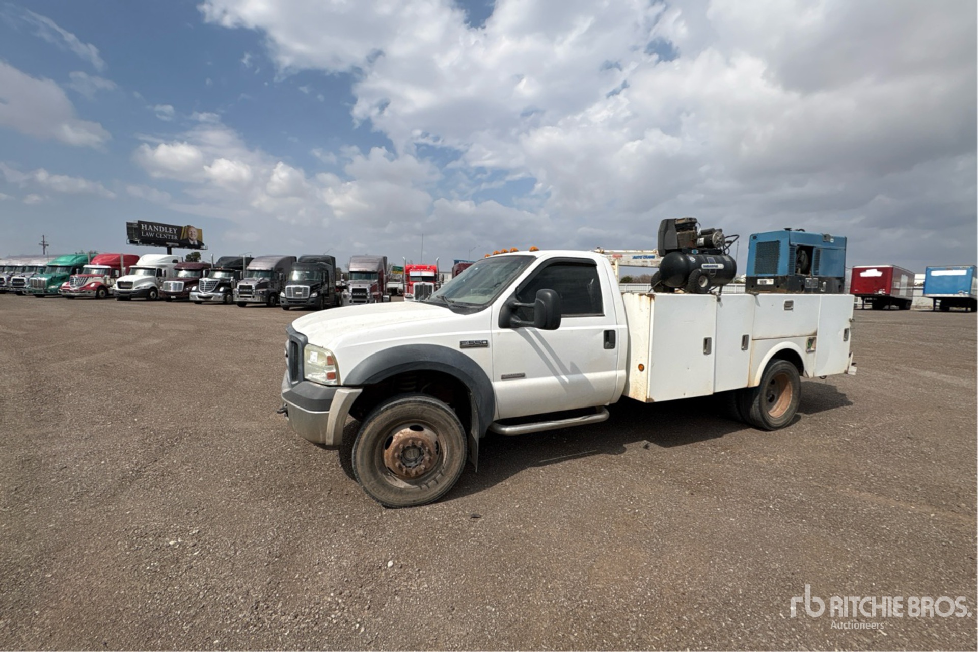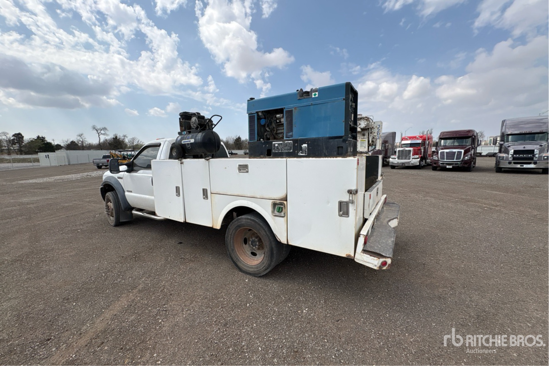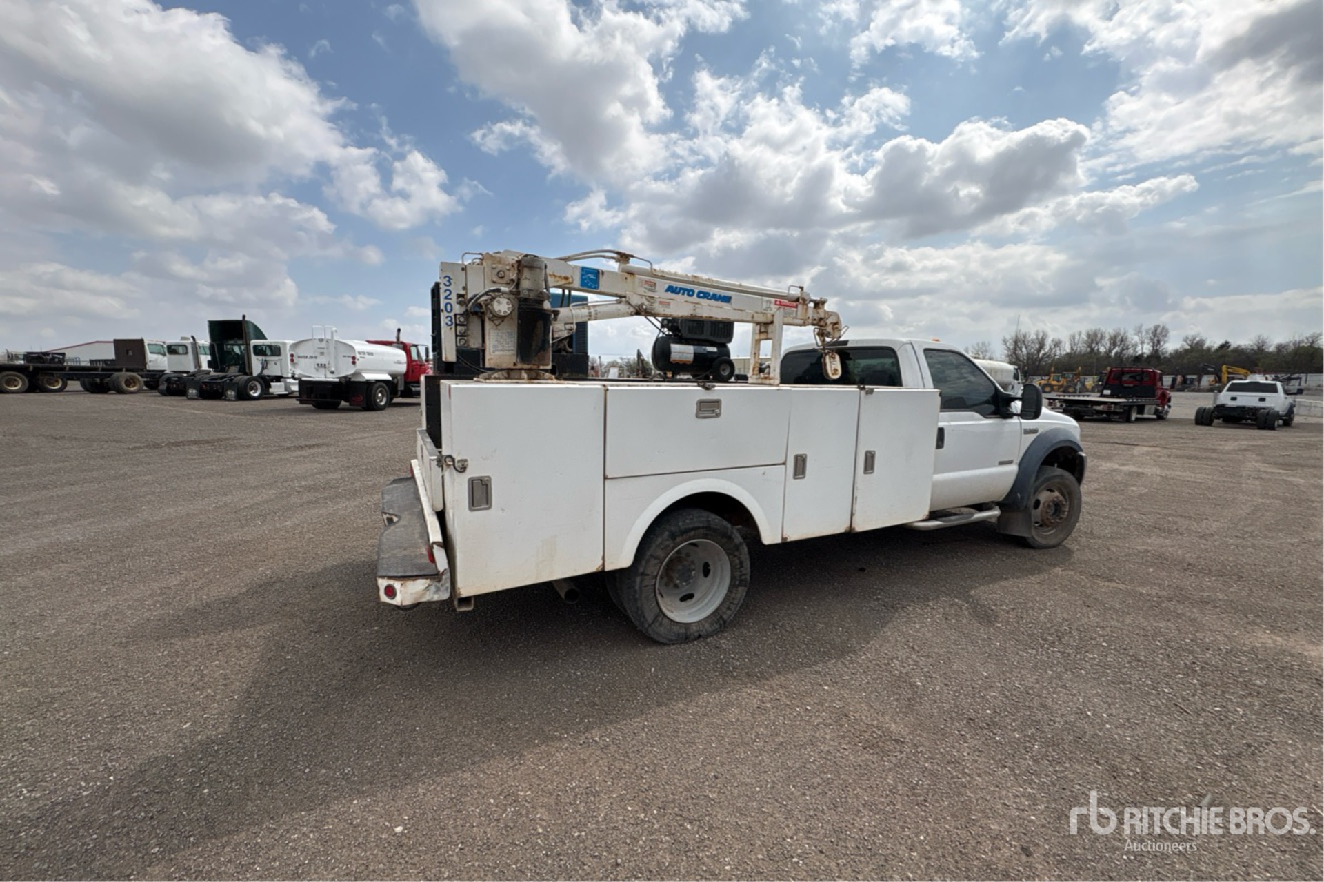 Ford power stroke V8 6 L Diesel Engine, 2006 US EPA Label, 6-Speed Manual Transmission, 7000 lb Front Axle, 13660 lb Rears, 17940 lb GVWR, 245/70R19.5 Front Tires, 245/70R19.5 Rear Tires, Spring Suspension, 165 in Wheelbase, 11 ft 2 in Body, Auto Crane 3203 3 Section Electric Crane, Industrial air Air Compressor, Miller Bobcat 250 D 10000 W 250 A Diesel Welder