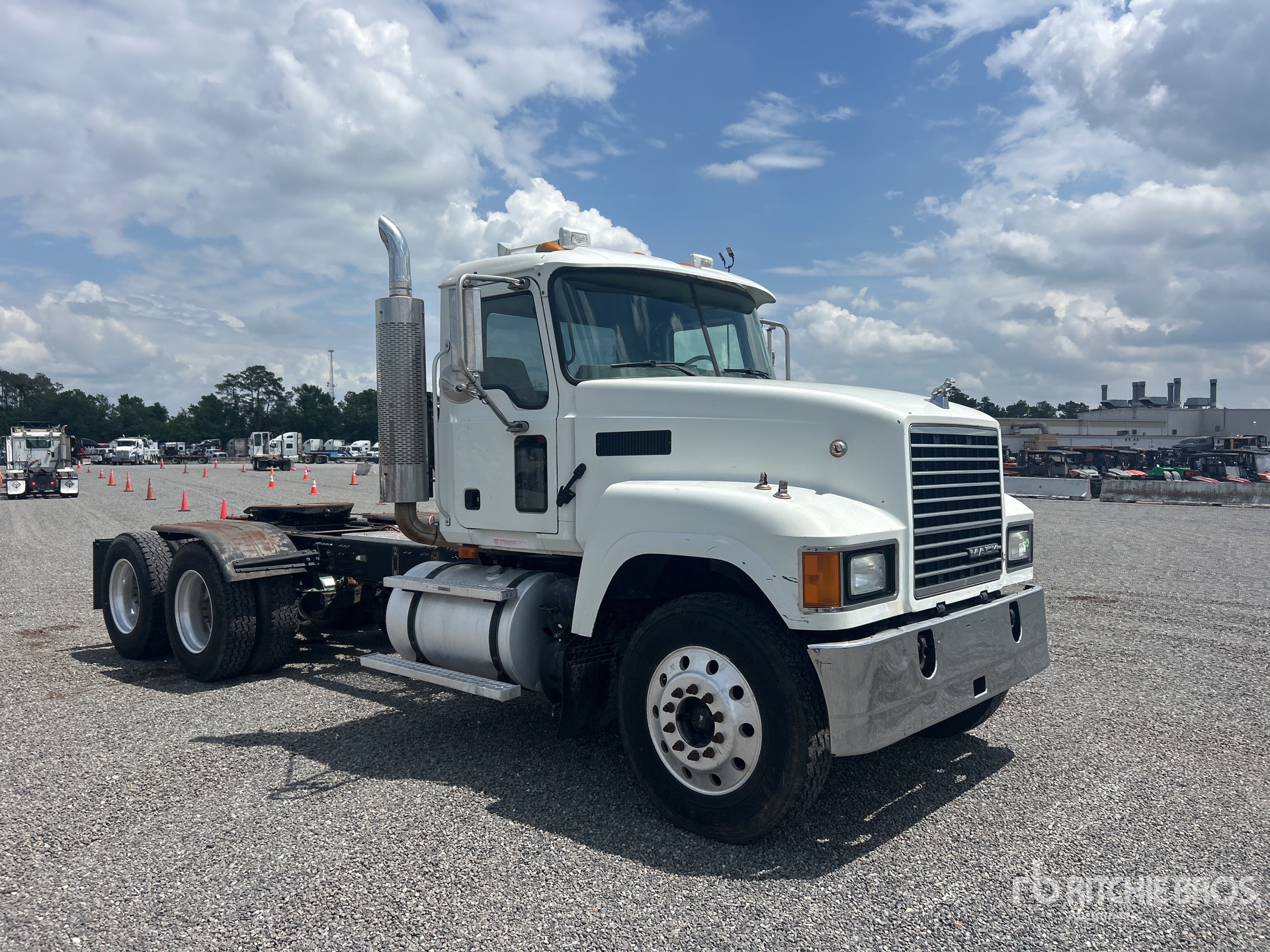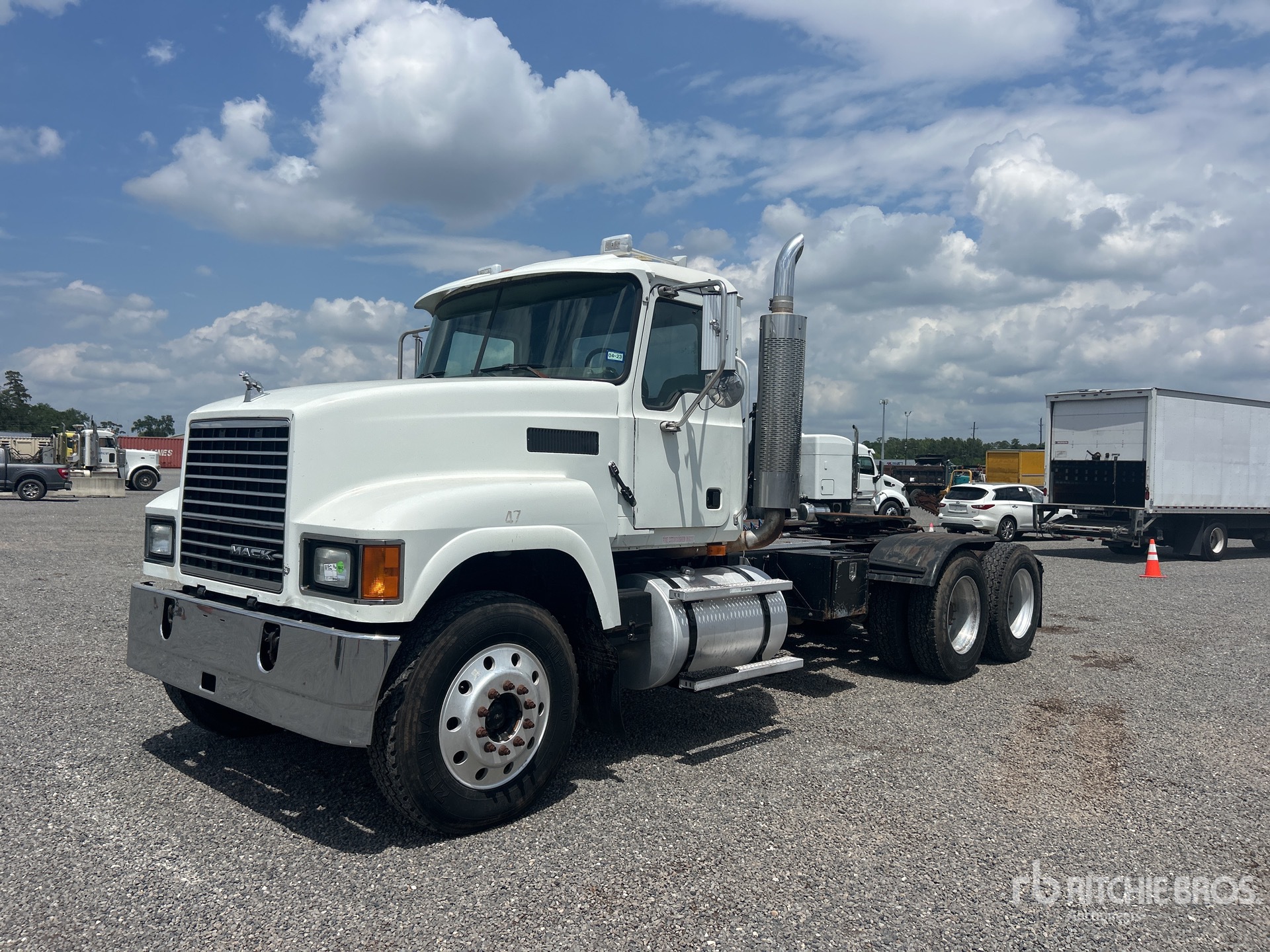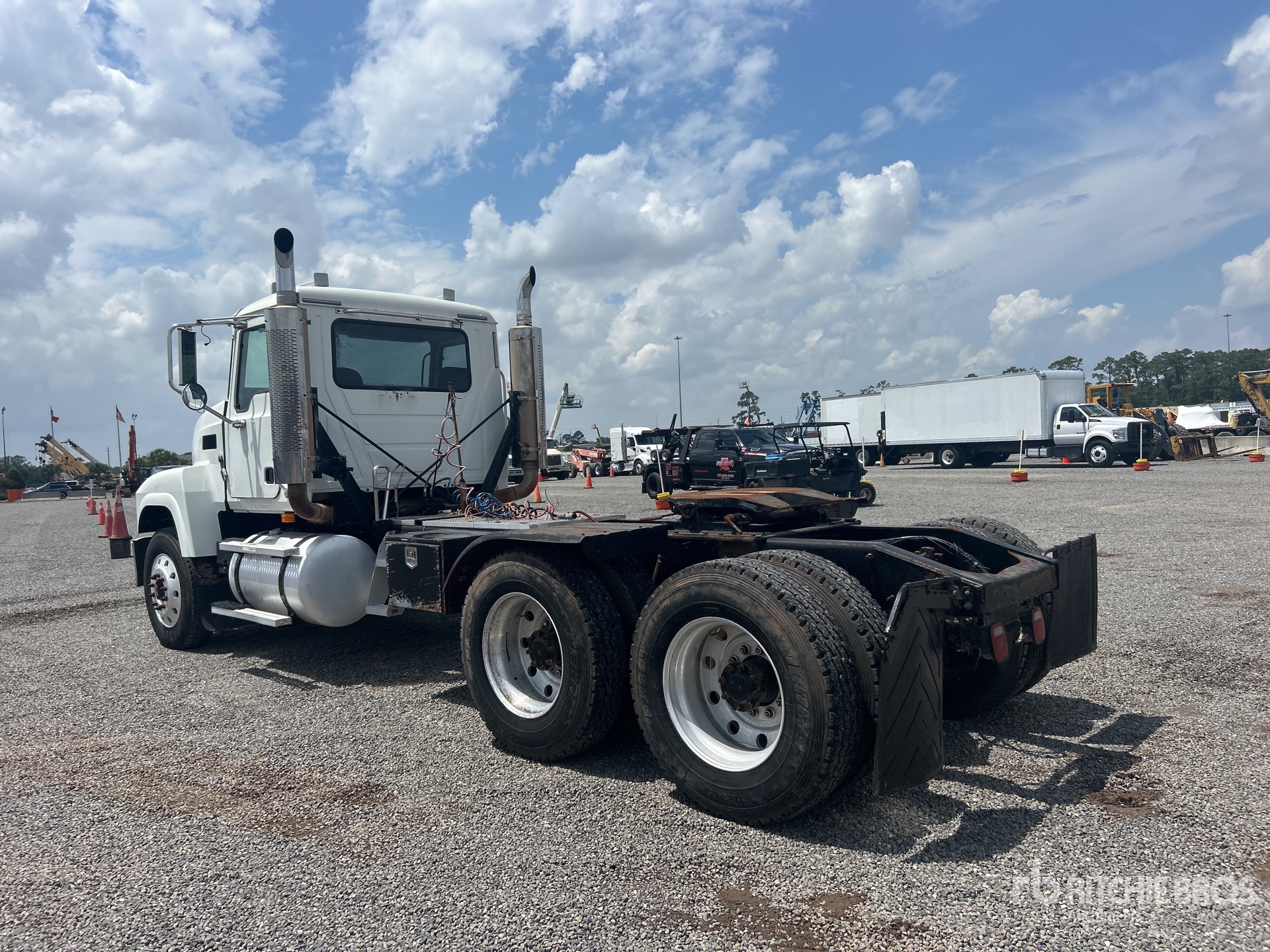 Mack Engine, 29682 Engine hrs, Eaton Fuller 13-Speed Manual Transmission, 13220 lb Front Axle, 38000 lb Rears, 51220 lb GVWR, Engine Brake, 219 in Wheelbase, Camelback, Aluminum Outer Wheels, 11R24.5, Air Sliding 5th Wheel, Dual Fuel Tanks