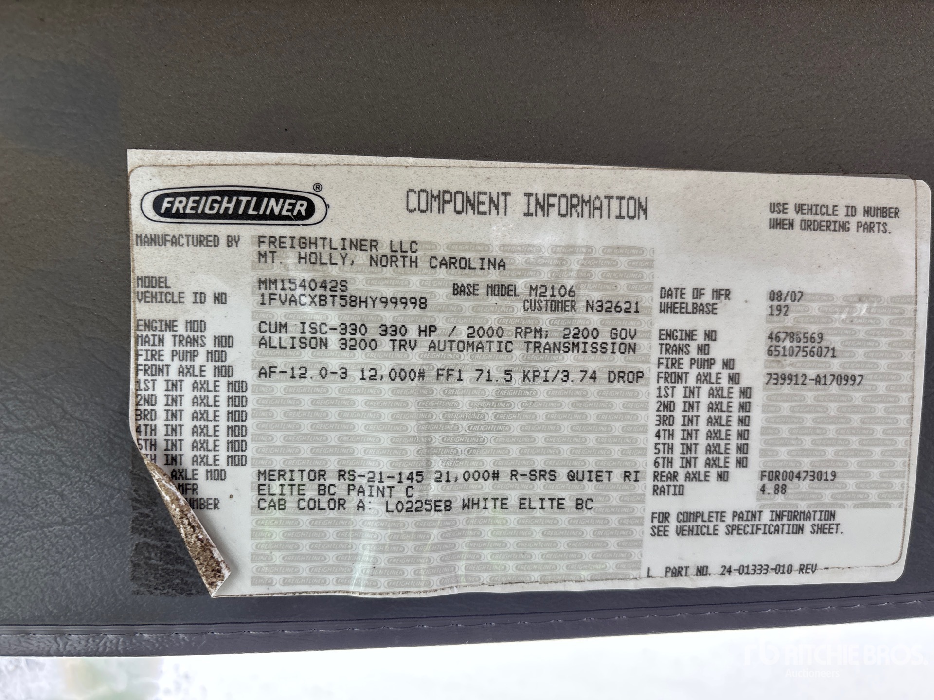 Cummins ISC 6 Cylinder 8.3 L Diesel 330 hp Engine, Engine Coolant Heater, 3151 Engine hrs, Engine Brake, Allison 3200TRV 6-Speed Automatic Transmission, Differential Lock, 12000 lb Front Axle, 21000 lb Rears, Meritor RS-21-145 Drive Axles, 4.88:1 Axle Ratio, 33000 lb GVWR, Aluminum Outer Wheels, 275/70R22.5, Airliner Air Ride Suspension, 192 in Wheelbase, 10 ft 3 in x 102 in Bed