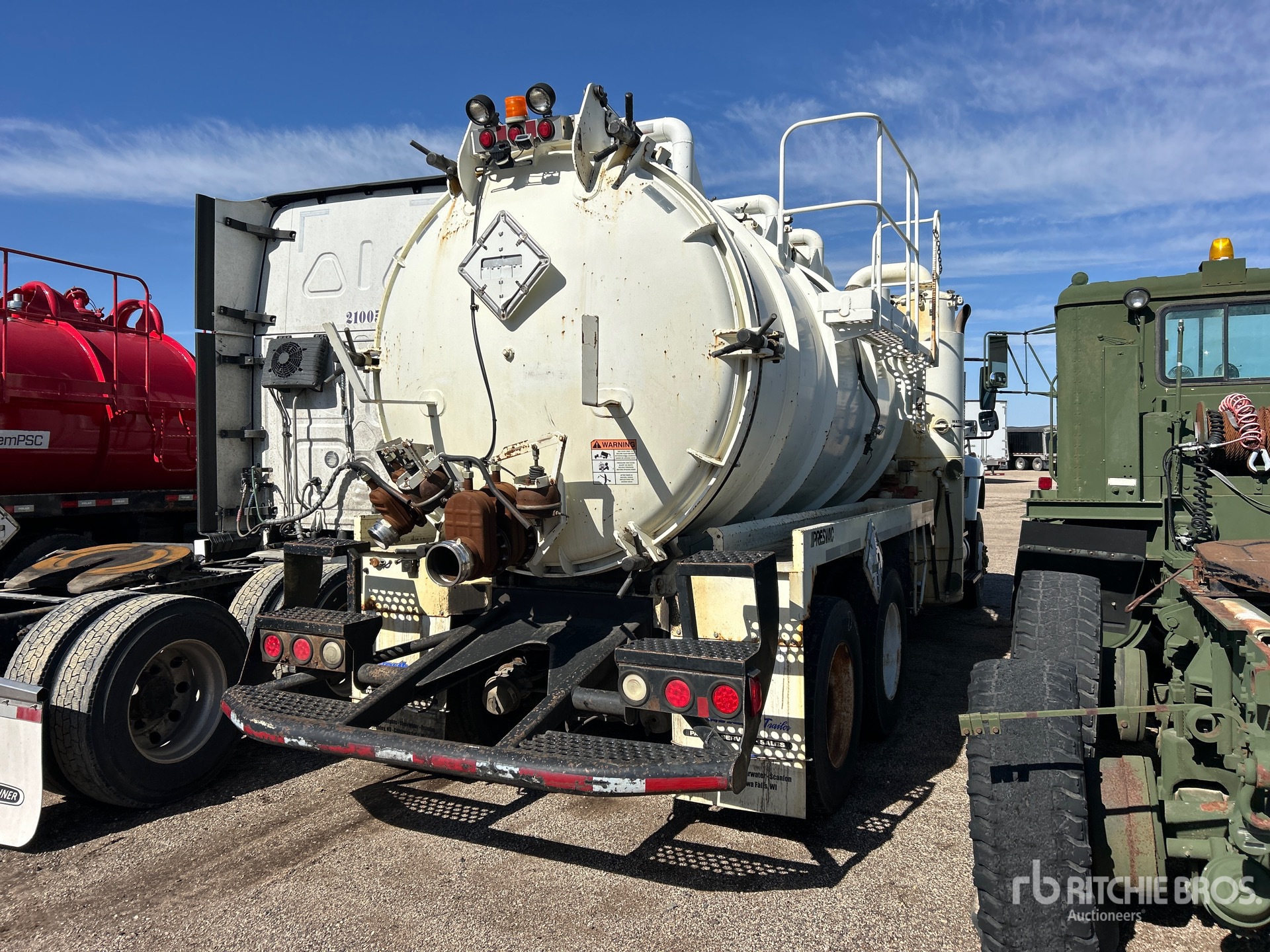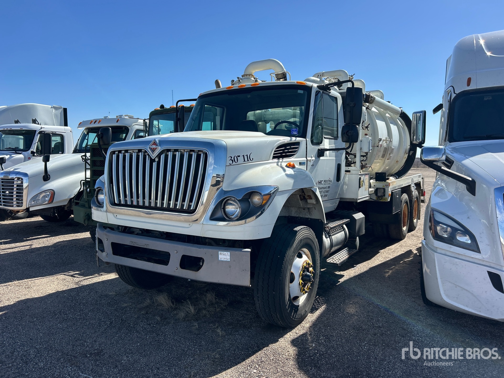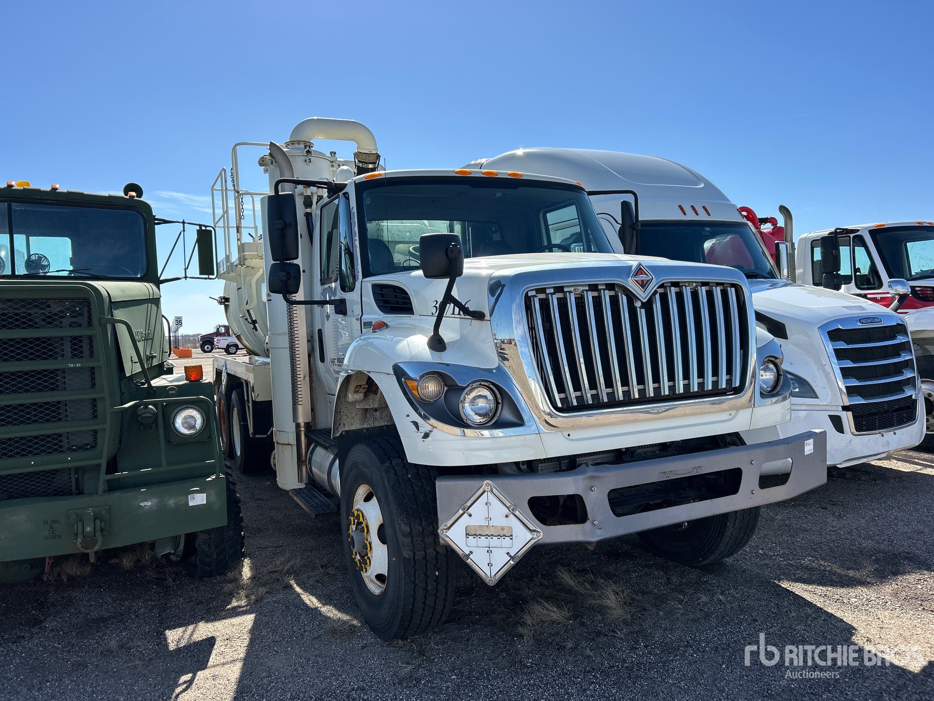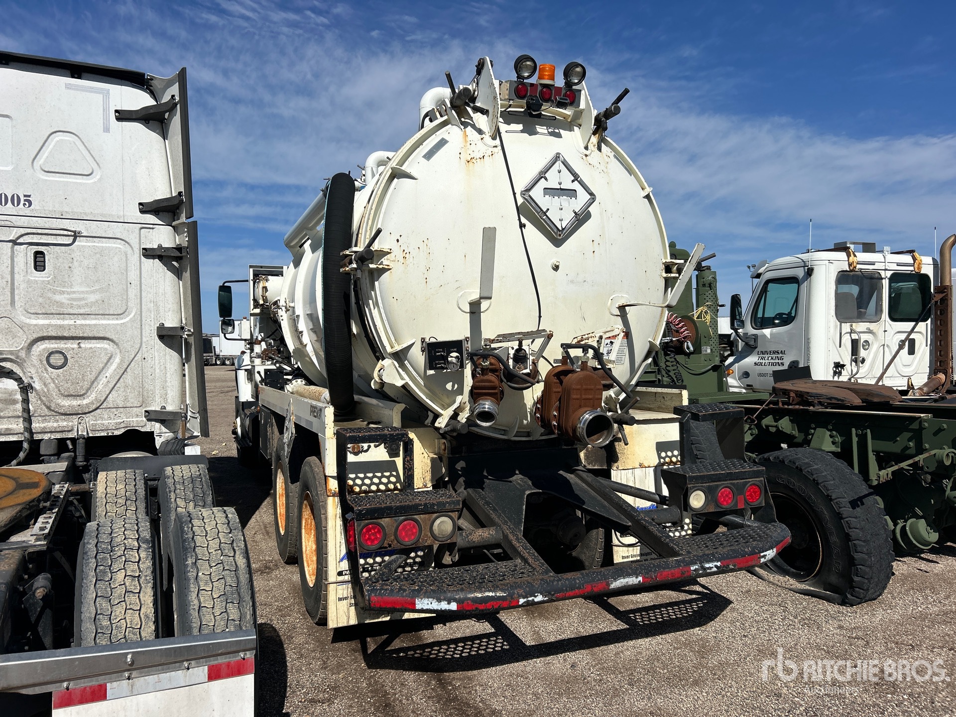 International 6 Cylinder Diesel Engine, Eaton Fuller Manual Transmission, 16000 lb Front Axle, 40000 lb Rears, 56000 lb GVWR, 315/80R22.5 Front Tires, 11R22.5 Rear Tires, Spring over Walking Beam Suspension, 232 in Wheelbase, PTO, Steel 3000 gal Debris Tank, Hydraulic Lift Tailgate, Manual Tailgate Locks, Hydraulic Driven Pump