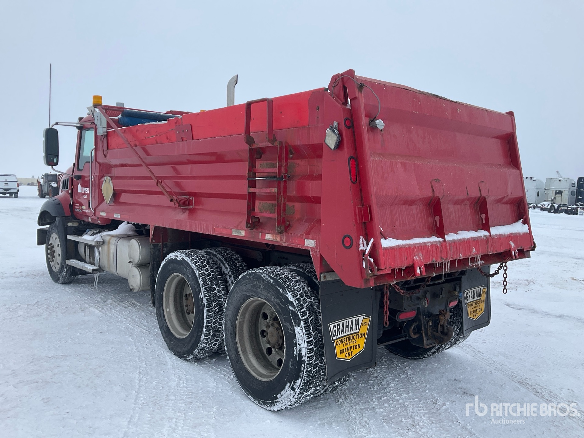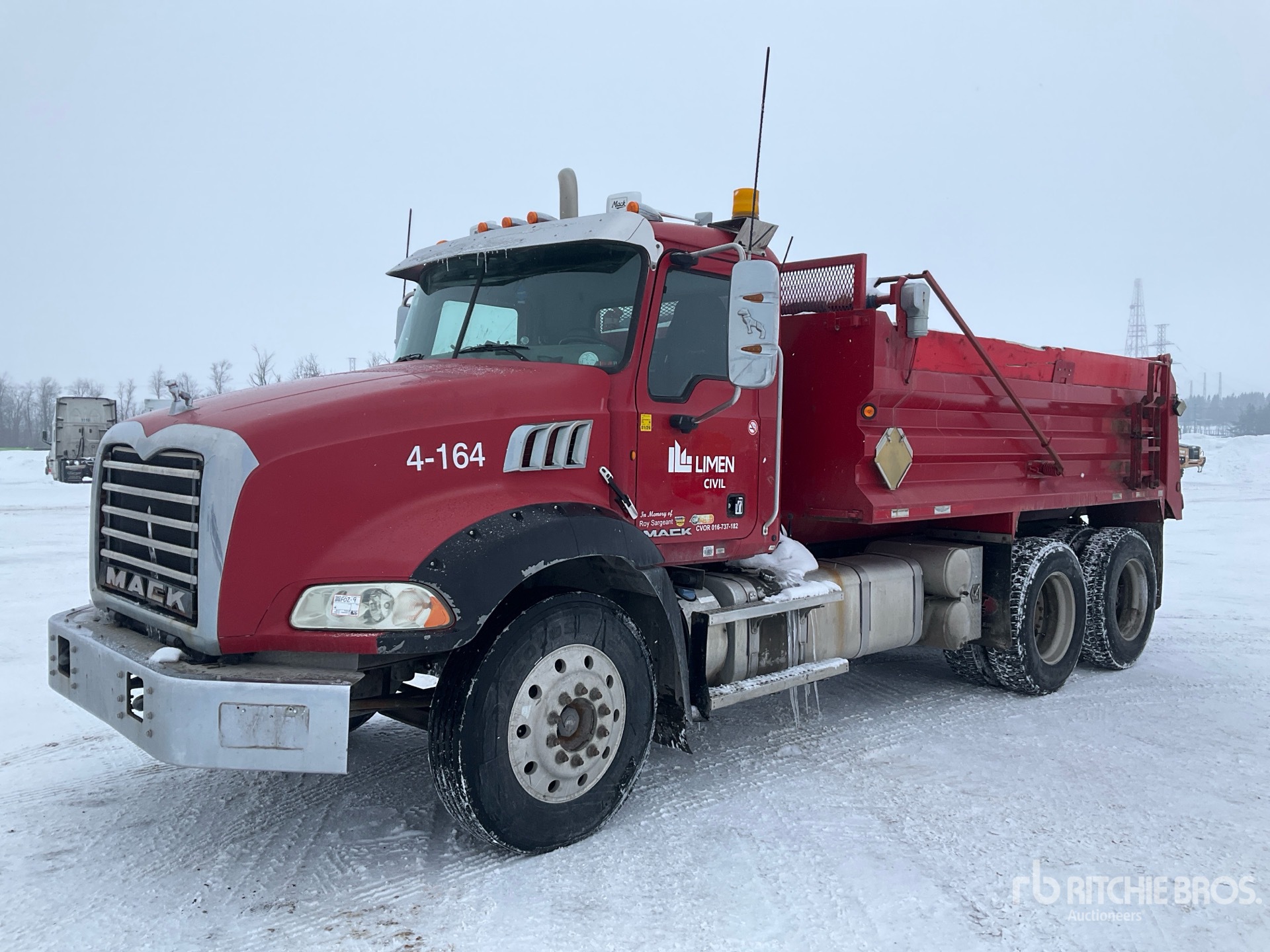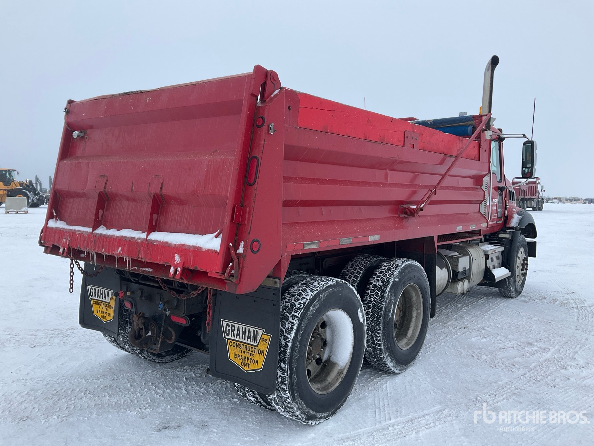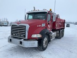 Mack MP8 6 Cylinder 12.8 L Diesel 425 hp Engine, 2011 US EPA Label, CARB Compliant, 16902 Engine hrs, Engine Brake, Allison Automatic Transmission, Differential Lock, 6496 kg Front Axle, 26454 kg GVWR, Aluminum Wheels, 11R24.5, Double Frame, Air Ride Suspension, 198 in Wheelbase, PTO, 15 ft Long x 2 ft 10 in High Steel Body, Electric Roll Tarp, Rear Hydraulics, Pintle Hitch