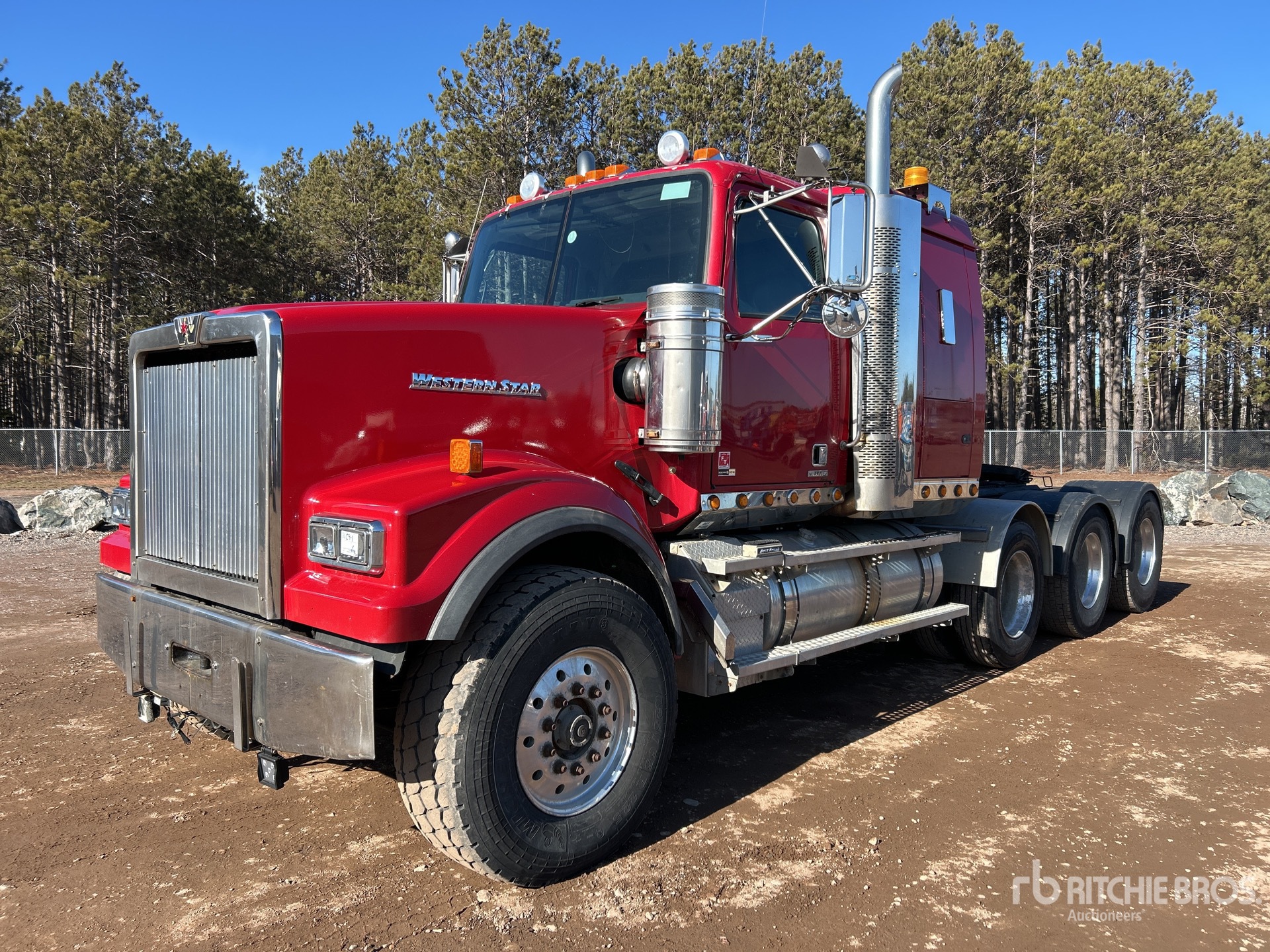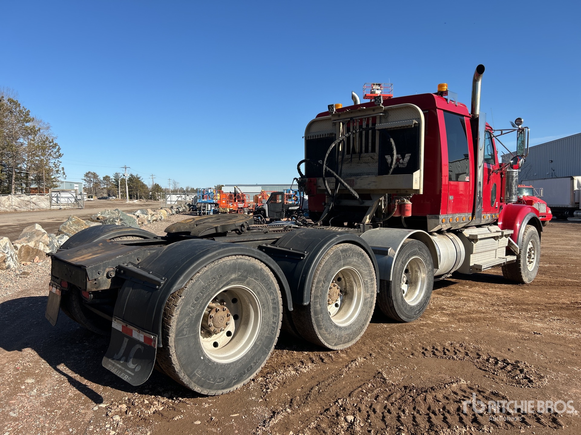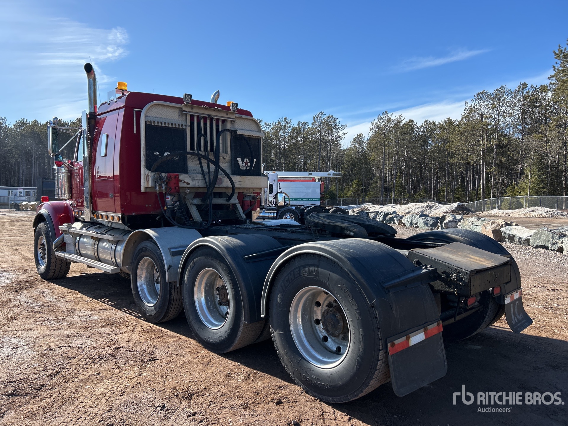 Detroit Engine, 22585 Engine hrs, Eaton Fuller 18-Speed Manual Transmission, Engine Brake, 54 in Flat Top Sleeper Cab, Bunk Heater, 244 in Wheelbase, Air Suspension, Air Lift Pusher Axle, Aluminum Outer Wheels, 425/65R22.5 Front Tires, 315/80R22.5 Rear Tires, Dual Steering Boxes, Double Frame, Wet Kit, Air Sliding 5th Wheel, Auto Lube, Headache Rack