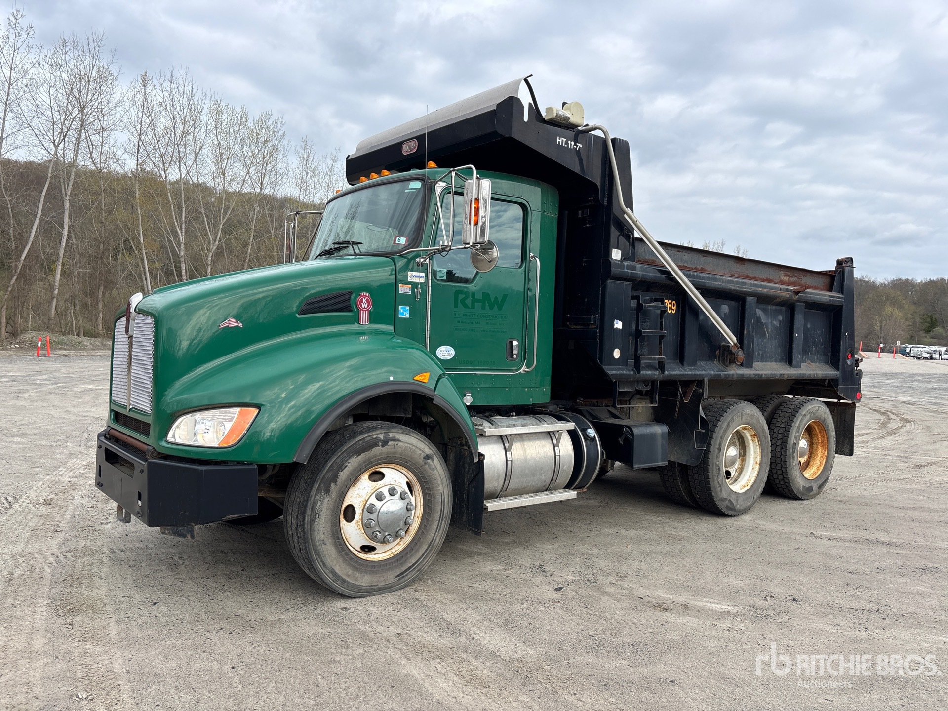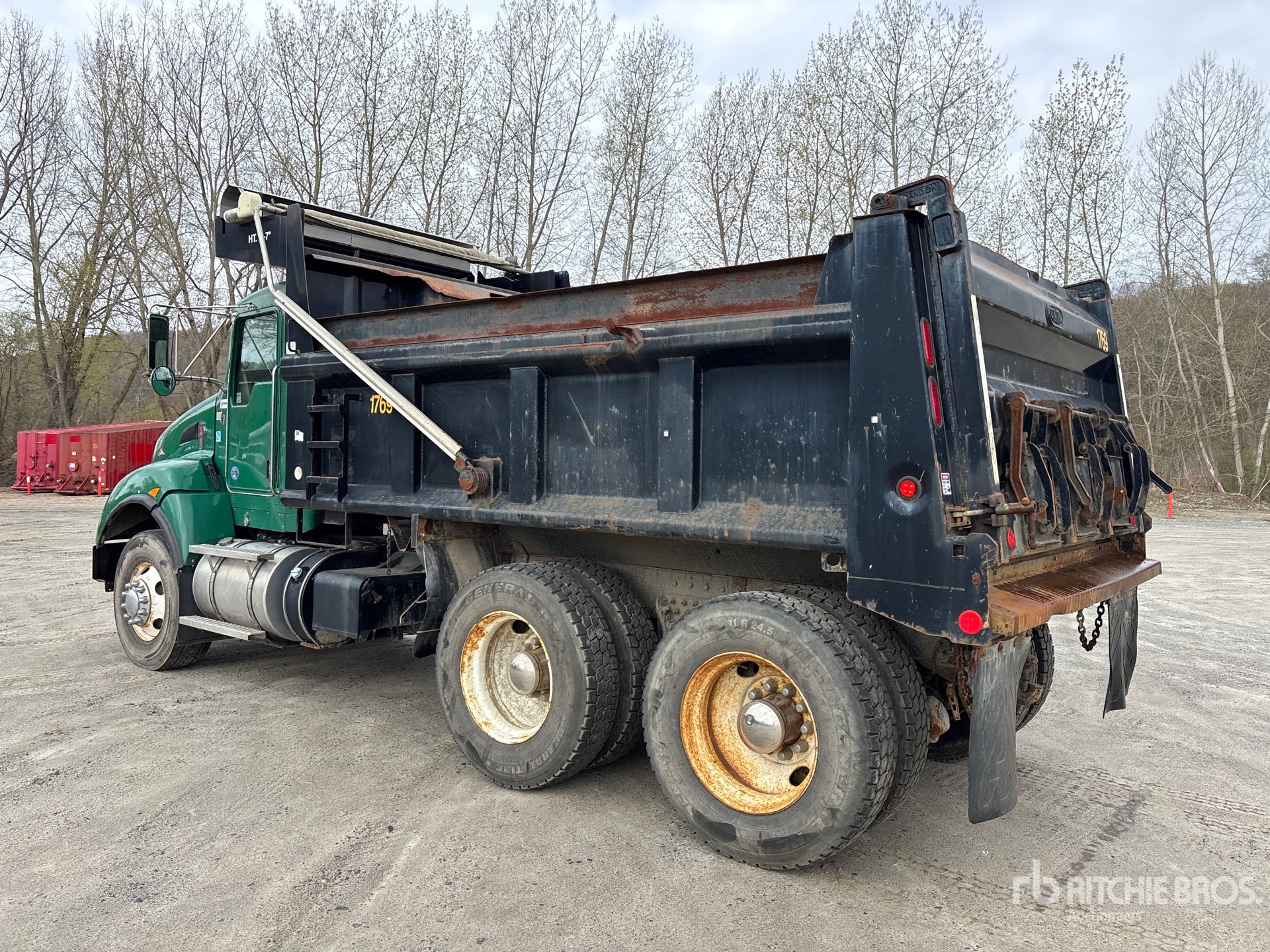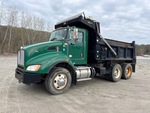 Paccar PX-8 6 Cylinder 8.3 L Diesel 330 hp Engine, 2012 US EPA Label, CARB Compliant, Requires Diesel Exhaust Fluid, 4996 Engine hrs, Eaton Fuller RTO11908LL 8LL Manual Transmission, 20000 lb Front Axle, 46000 lb Rears, Dana D46-170H Drive Axles, 4.78:1 Axle Ratio, 66000 lb GVWR, Air Ride Cab, 315/80R22.5 Front Tires, 11R24.5 Rear Tires, Double Frame, Hendrickson Haulmaax Rubber over Walking Beam Suspension, 182 in Wheelbase, PTO, Brandon 14 ft Long x 48 in High Steel Body, Electric Roll Tarp, Triple Tailgate Chutes, Pintle Hitch