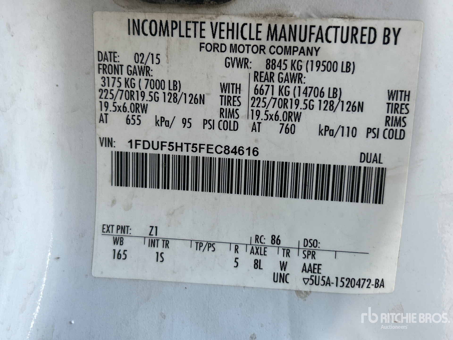 Located in Lane 8 Spot 38, Ford 6.7 L Diesel 300 hp Engine, 2015 US EPA Label, Requires Diesel Exhaust Fluid, 12075 Engine hrs, Automatic Transmission, 7000 lb Front Axle, 14706 lb Rears, 19500 lb GVWR, 225/70R19.5, Spring Suspension, 165 in Wheelbase, Steel Tank, PTO Driven Pump