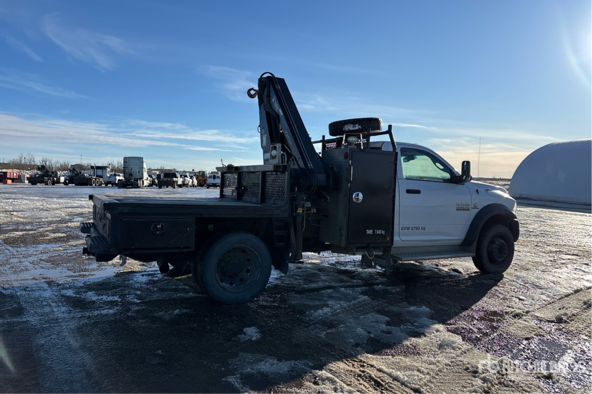 Cummins 6 Cylinder 6.7 L Diesel Engine, 2014 US EPA Label, Requires Diesel Exhaust Fluid, 6449 Engine hrs, Engine Brake, Exhaust Brake, Automatic Transmission, 7250 lb Front Axle, 13500 lb Rears, 19500 lb GVWR, 225/70R19.5, Spring Suspension, 169 in Wheelbase, 1.6 m - 11 m 4 Section Boom, Out and Down Outriggers, 11 ft x 94 in Bed
