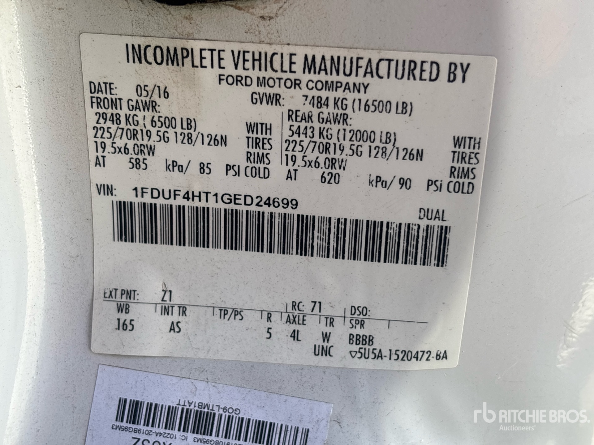 Ford Powerstroke V8 6.7 L Diesel Engine, 2016 US EPA Label, Requires Diesel Exhaust Fluid, Automatic Transmission, 6500 lb Front Axle, 12000 lb Rears, 16500 lb GVWR, 225/70R19.5 Front Tires, 225/70R19.5 Rear Tires, Spring Suspension, 165 in Wheelbase, 12 ft x 8 in Bed
