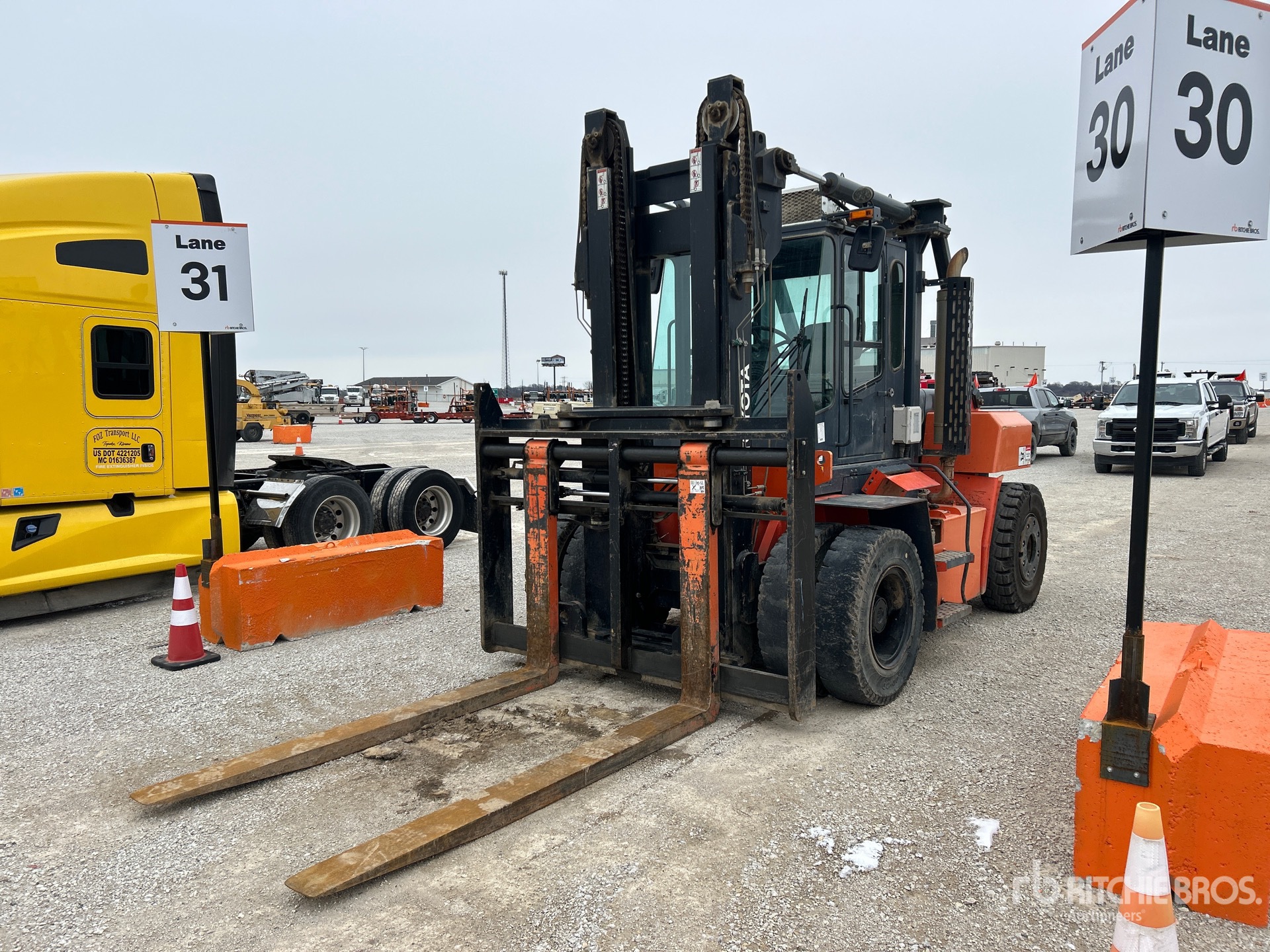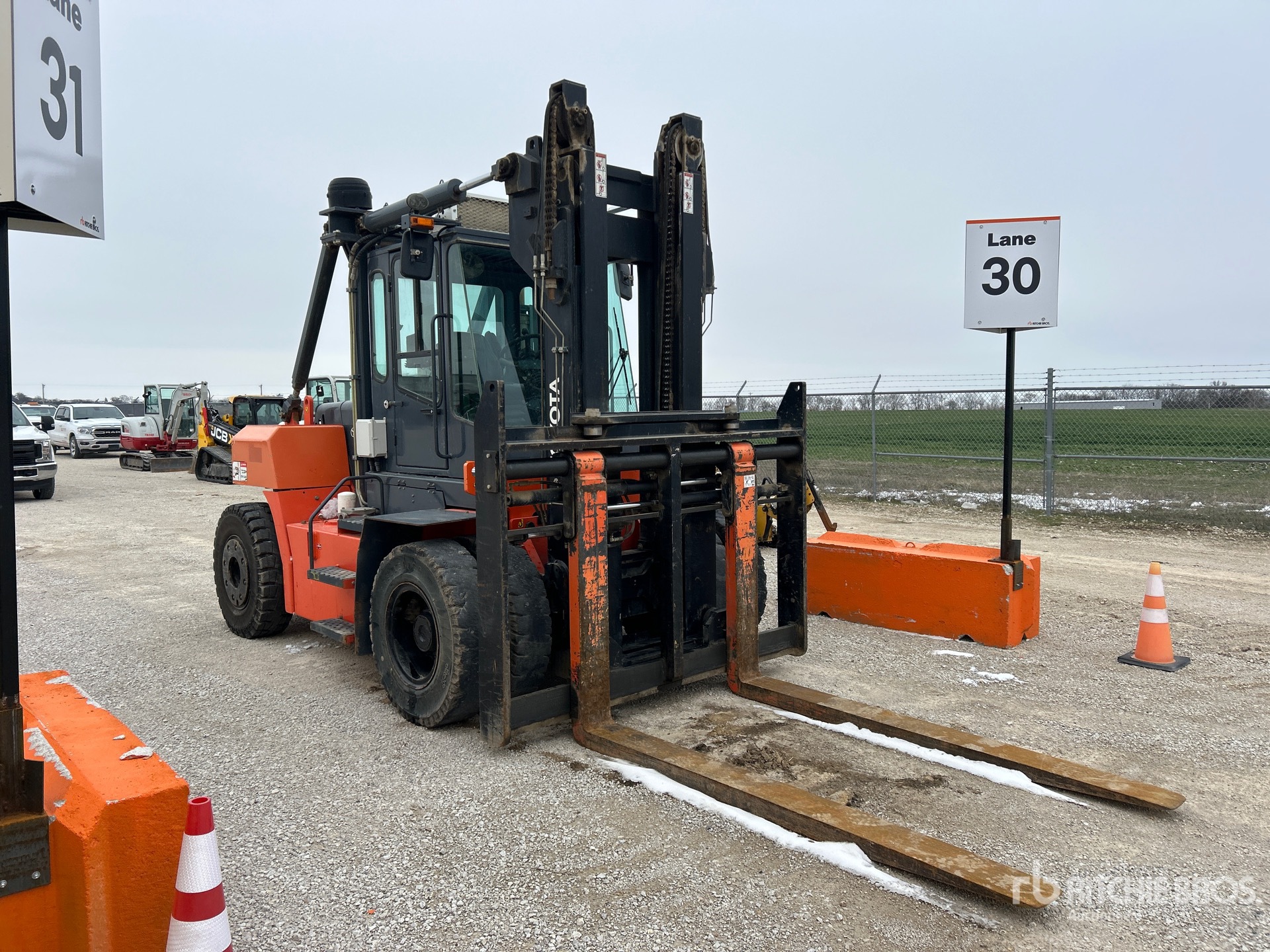 Enclosed Cab, 2 Stage Mast, 144 in Max Lift Height, 140 in Lowered Mast Height, 95 in Forks, Fork Positioner, Solid Pneumatic Tires, 6 Cylinder Diesel Engine