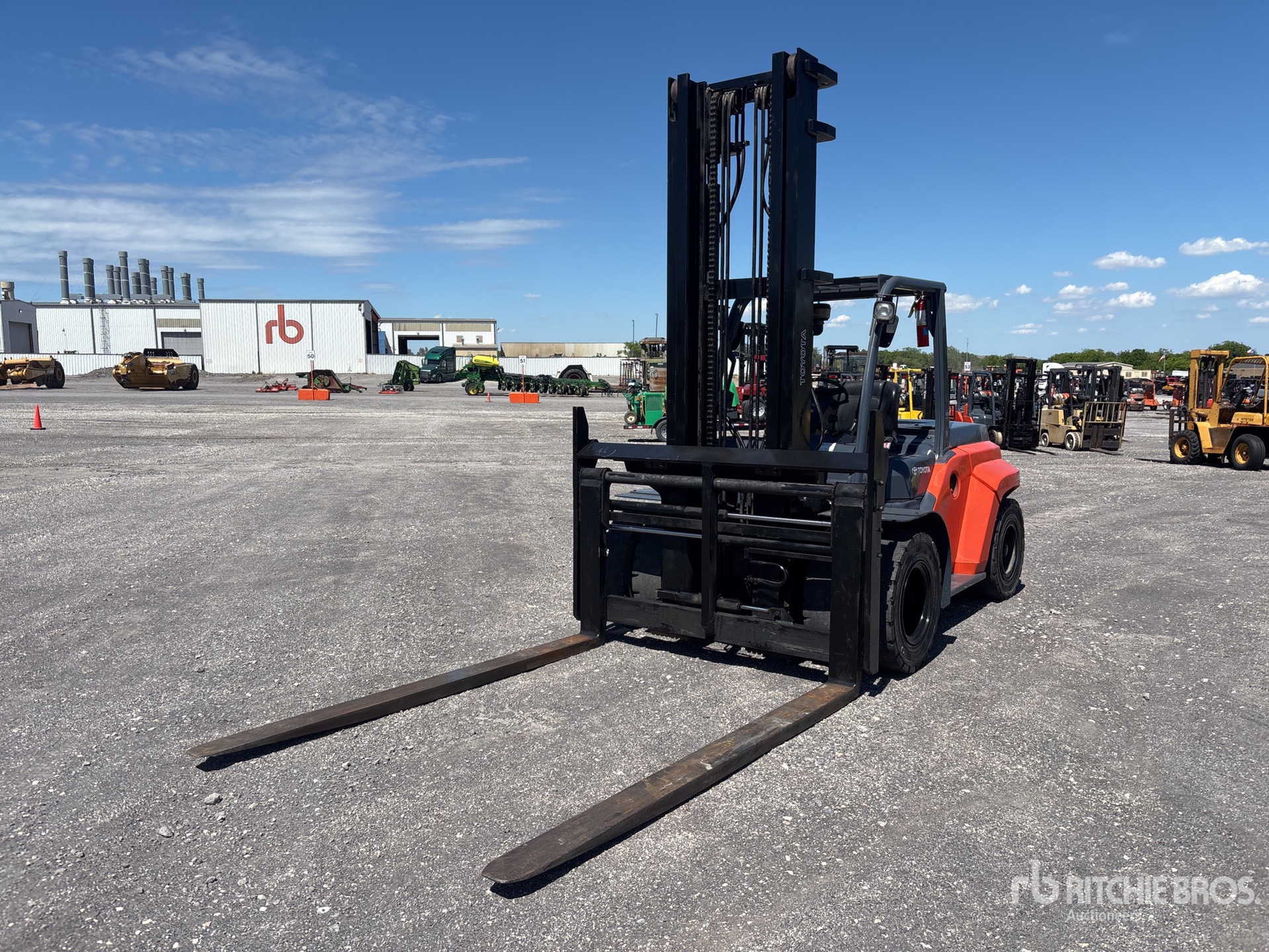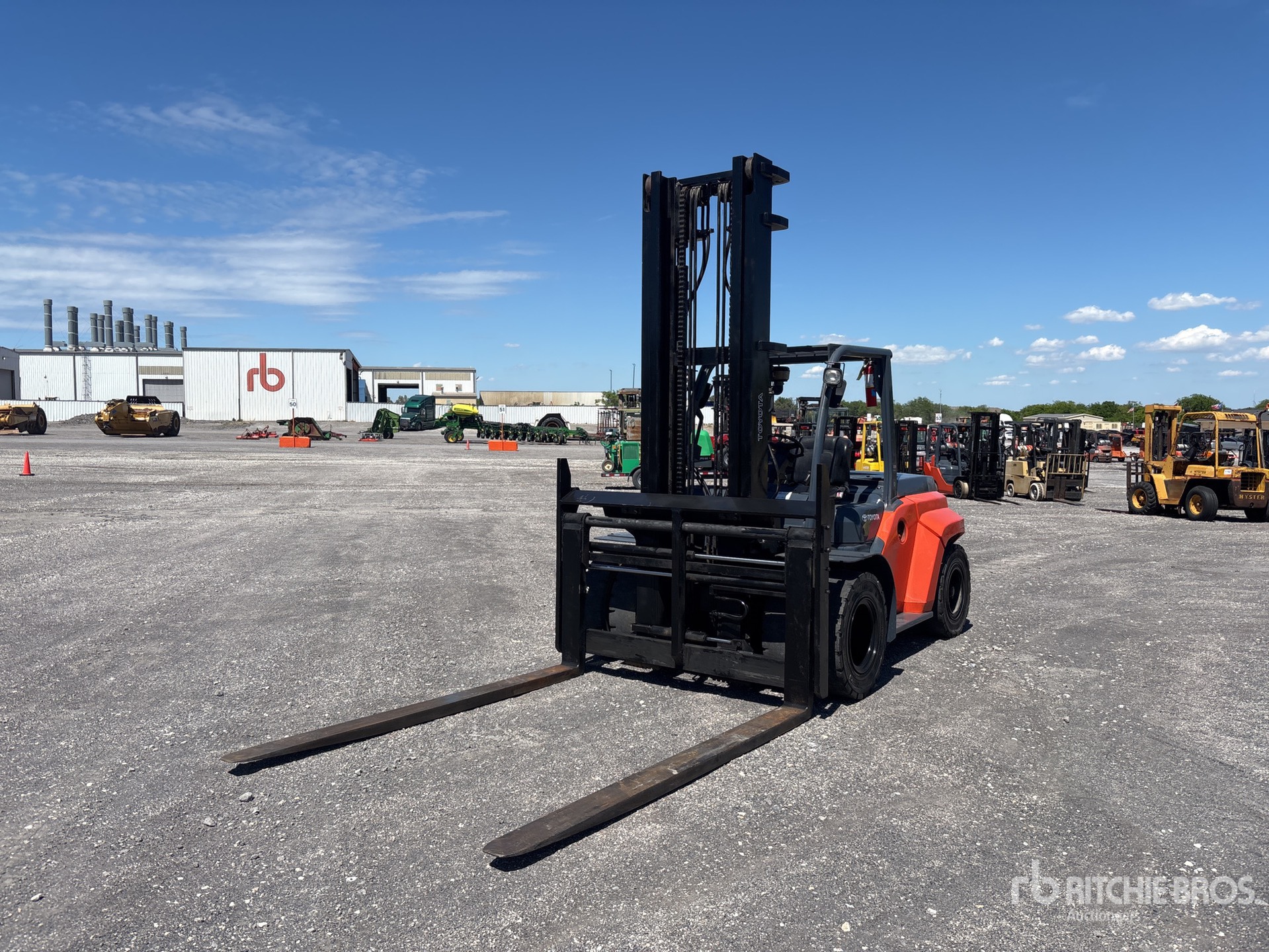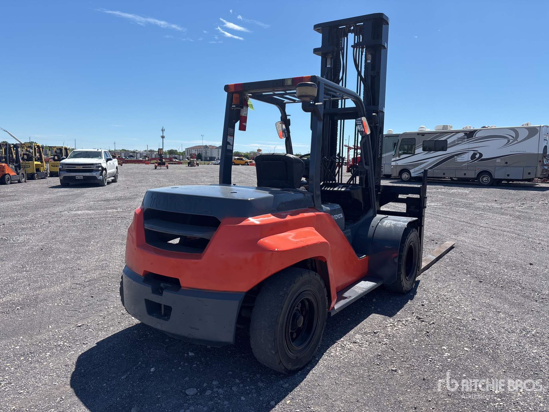 2 Stage Mast, 179.5 in Max Lift Height, 129 in Lowered Mast Height, 96 in Forks, Side Shift, Fork Positioner, Solid Pneumatic Tires, Tier 4, 2018 US EPA Label, Toyota 4 Cylinder 2.9 L Diesel Engine