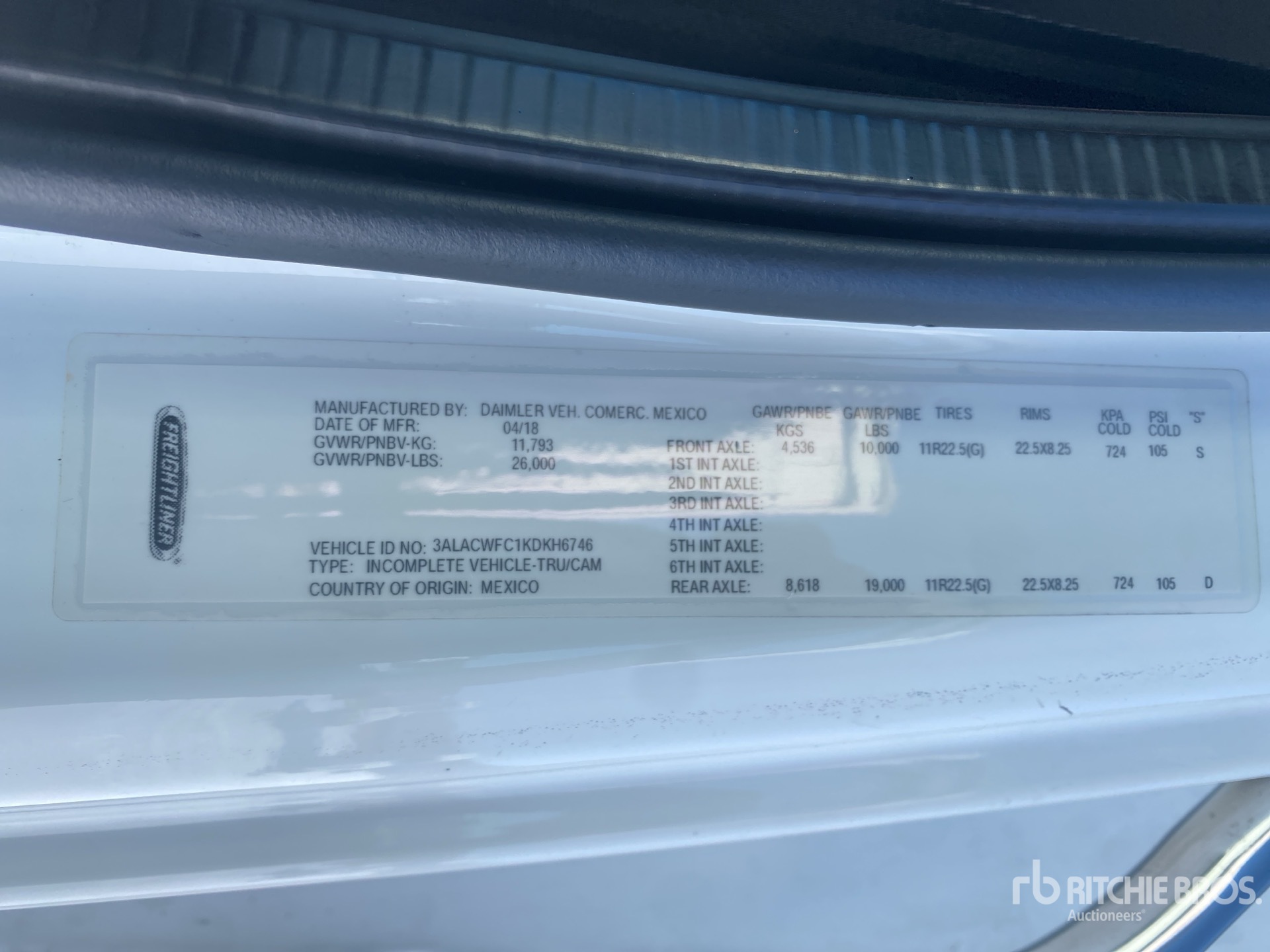 Cummins B 6.7 220 6 Cylinder 6.7 L Diesel 220 hp Engine, 2019 US EPA Label, Requires Diesel Exhaust Fluid, 3884 Engine hrs, Allison 2200 Automatic Transmission, 10000 lb Front Axle, 19000 lb Rears, Meritor MS-19-14X Drive Axles, 5.29:1 Axle Ratio, 26000 lb GVWR, Aluminum Wheels, 11R22.5, Airliner Air Ride Suspension, 270 in Wheelbase, Morgan 26 ft x 102 in Wide x 97 in High Body, Liftgate