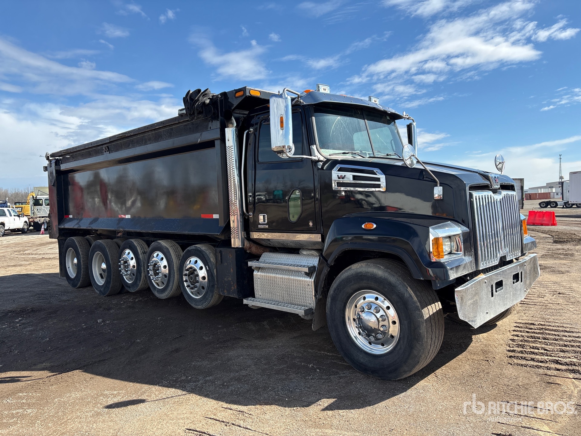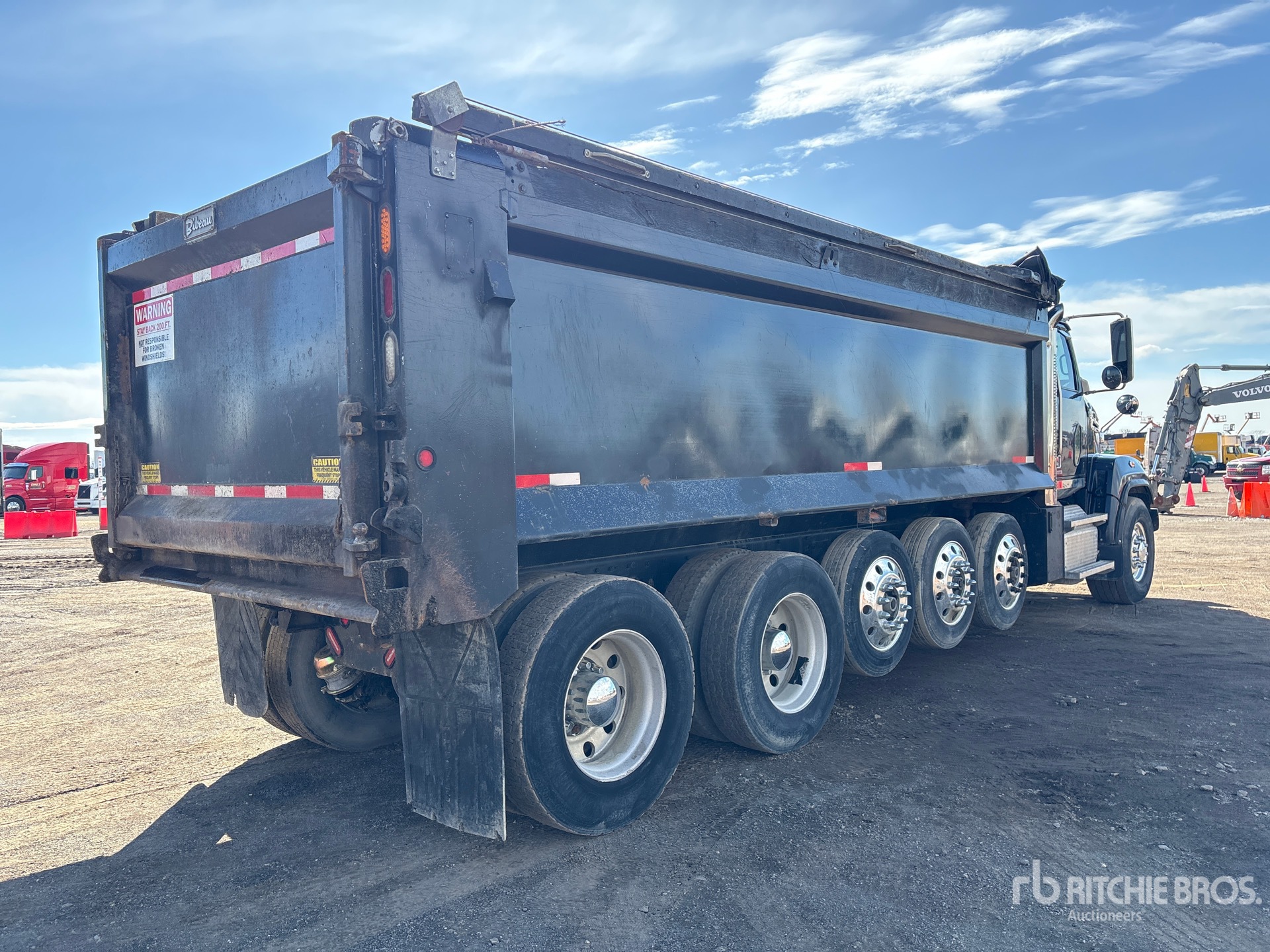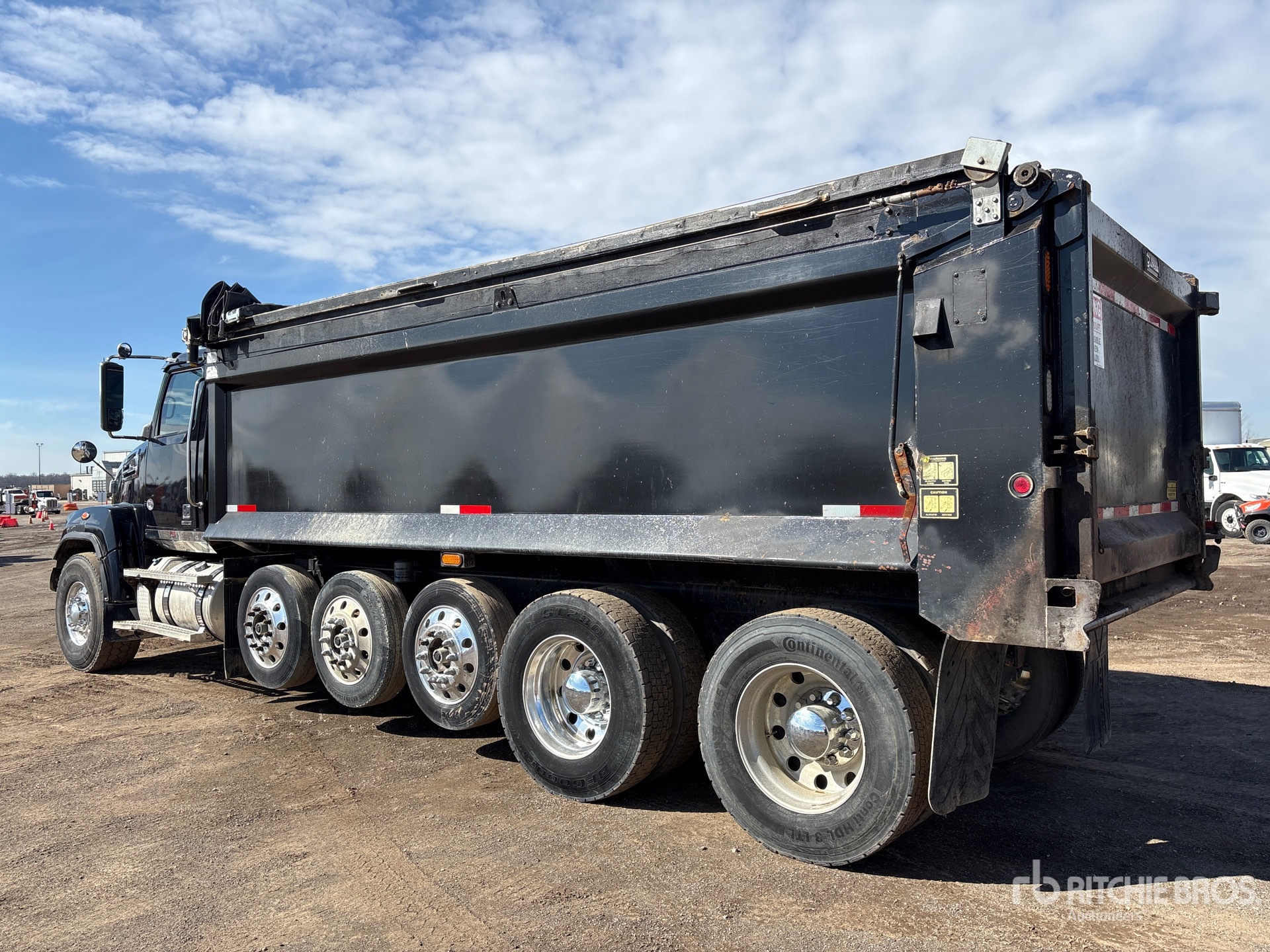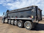 Detroit DD13 6 Cylinder 12.8 L Diesel Engine, 2019 US EPA Label, Requires Diesel Exhaust Fluid, Engine Brake, Allison Automatic Transmission, 20000 lb Front Axle, 46000 lb Rears, 66000 lb GVWR, Air Ride Cab, Aluminum Outer Wheels, 425/65R22.5 Front Tires, 11R22.5 Rear Tires, 3 Steerable Air Lift Pusher Axle, Hendrickson Haulmaax Rubber over Walking Beam Suspension, 268 in Wheelbase, PTO, CMW 21 ft Long x 5 ft 6 in High Steel Body, Round Bottom, Electric Roll Tarp