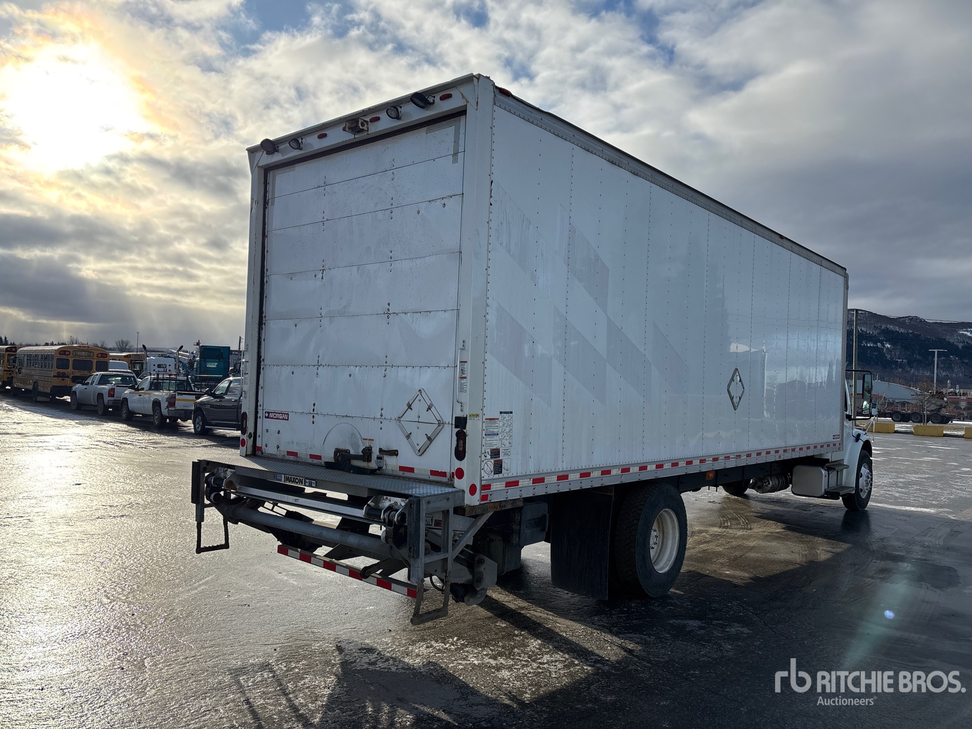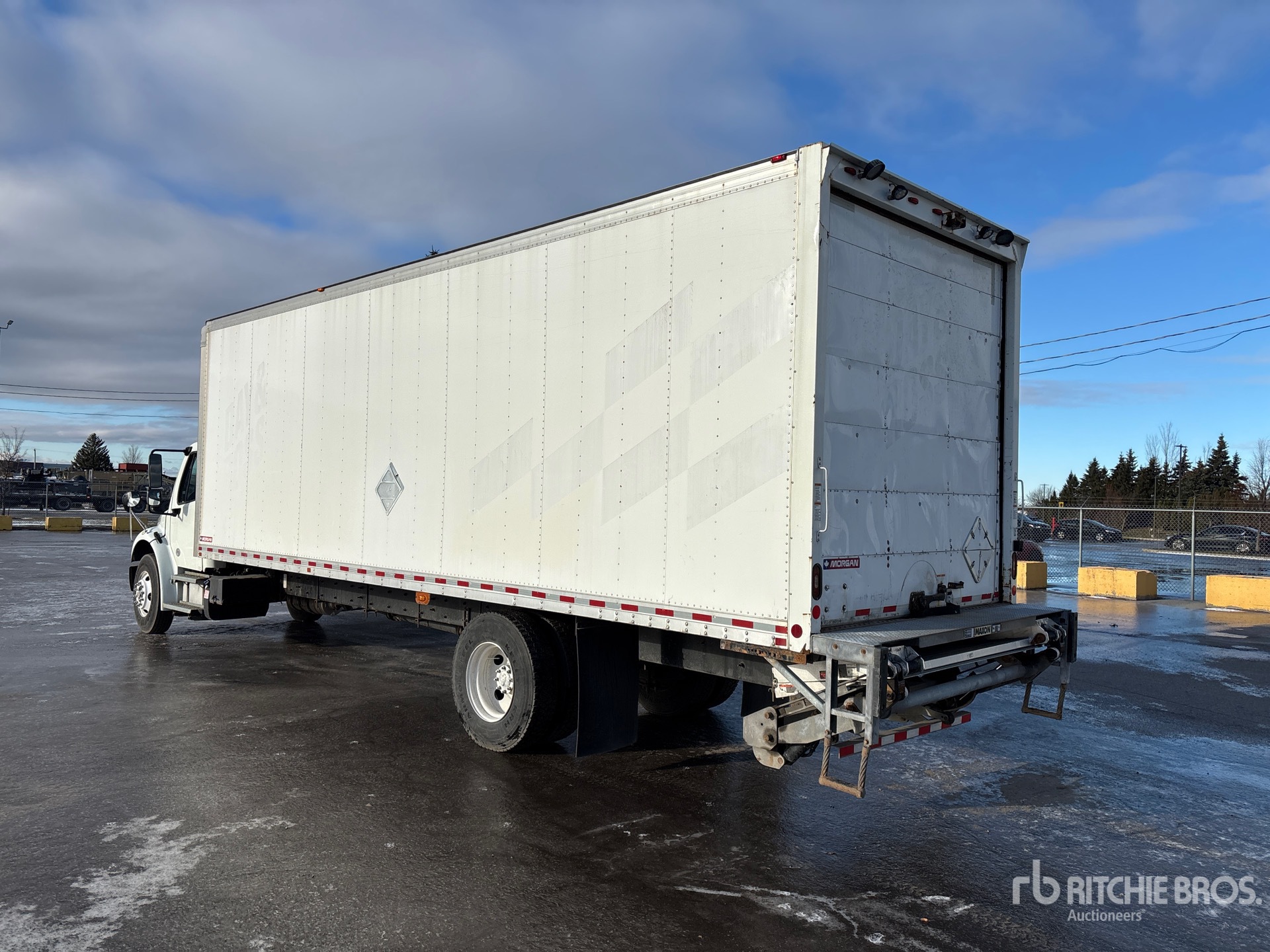 Located in Lane 9 Spot 11, Cummins B6.7 6 Cylinder 6.7 L Diesel 280 hp Engine, 2018 US EPA Label, 9832 Engine hrs, Allison 2500 Automatic Transmission, 12000 lb Front Axle, 21000 lb Rears, 14968 kg GVWR, Air Ride Cab, Aluminum Wheels, 11R22.5 Front Tires, 11R22.5 Rear Tires, Air Ride Suspension, 295 in Wheelbase, Morgan 28 ft x 102 in Wide x 103 in High Body, Liftgate