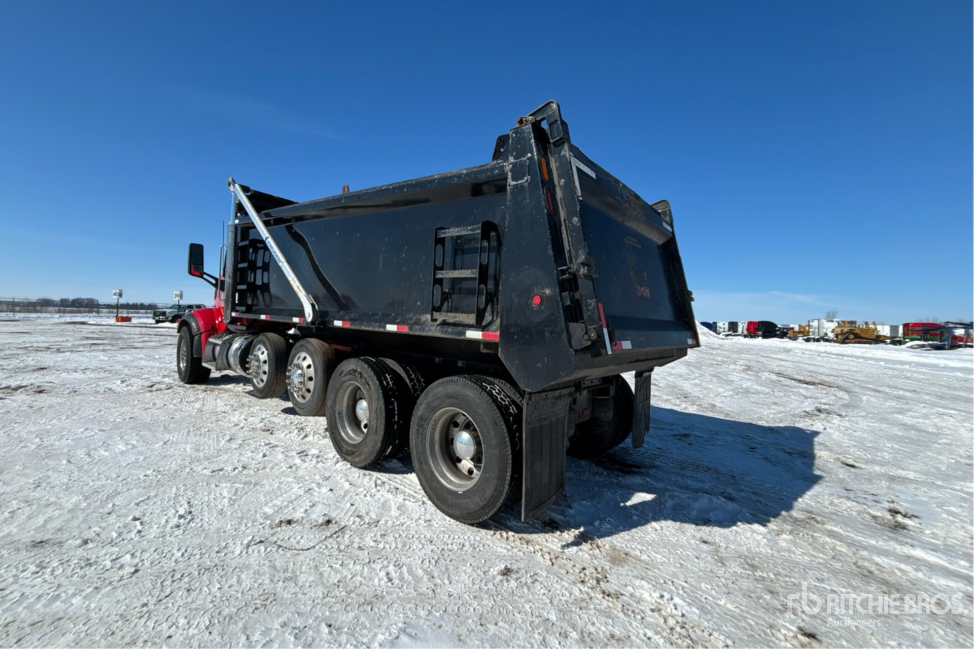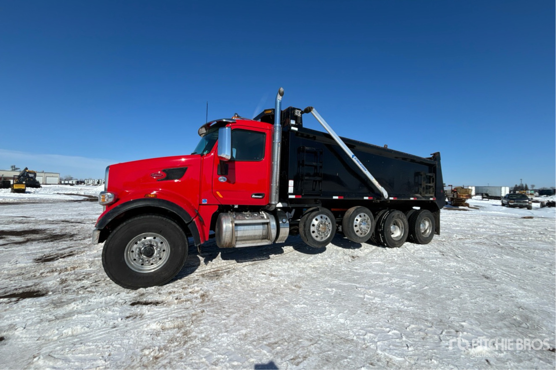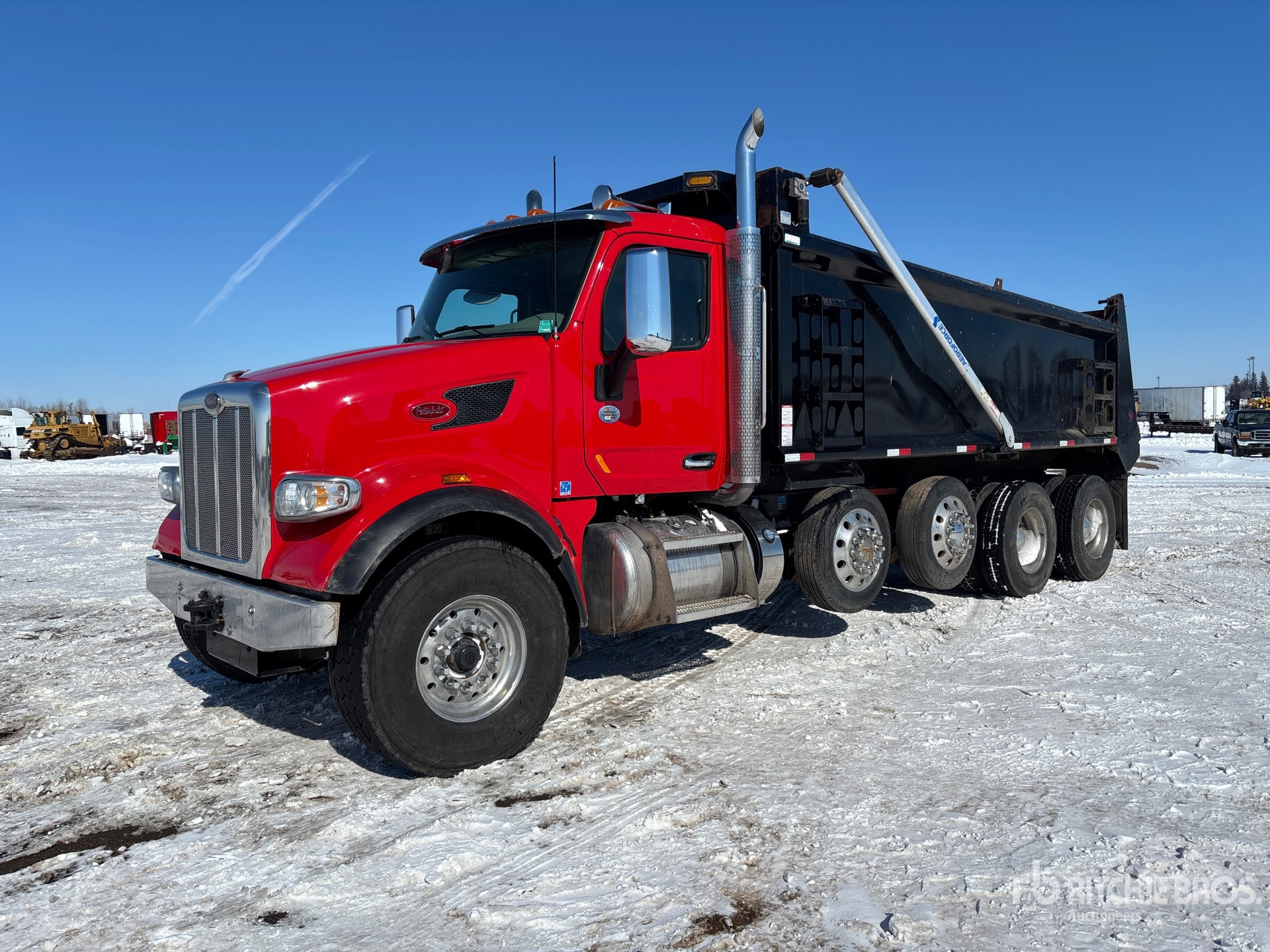 Located in Lane 9 Spot 9, Paccar MX-11 6 Cylinder 10.8 L Diesel 430 hp Engine, 2020 US EPA Label, Engine Brake, Allison Automatic Transmission, Differential Lock, 20000 lb Front Axle, 46000 lb Rears, 80000 lb GVWR, Aluminum Wheels, 425/65R22.5 Front Tires, 11R22.5 Rear Tires, 2 Steerable Air Lift Pusher Axle, Dual Steering Boxes, Double Frame, Air Trac Air Ride Suspension, 260 in Wheelbase, PTO, Brandon 19 ft Long x 4 ft 6 in High Steel Body, Electric Roll Tarp