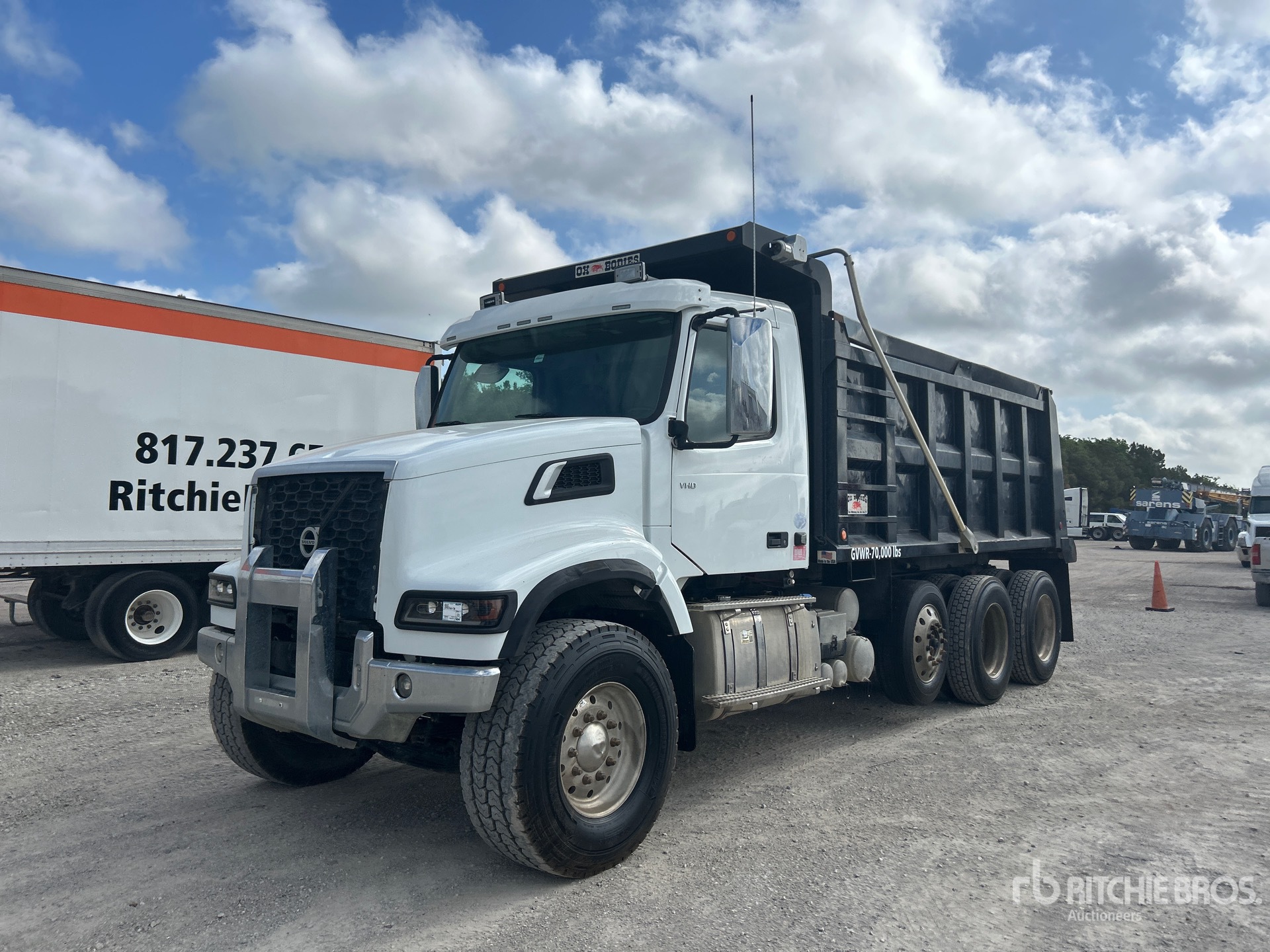 Located in Lane 44 Spot 15, Volvo D13 6 Cylinder 12.8 L Diesel 435 hp Engine, 2021 US EPA Label, Requires Diesel Exhaust Fluid, 4878 Engine hrs, Engine Brake, Volvo ATO2612F 12-Speed Automated Transmission, Differential Lock, 20000 lb Front Axle, 59000 lb Rears, Meritor MT-46-16 Drive Axles, 3.73:1 Axle Ratio, 56000 lb GVWR, Air Ride Cab, Aluminum Wheels, 425/65R22.5 Front Tires, 11R24.5 Rear Tires, Steerable Air Lift Pusher Axle, Dual Steering Boxes, Spring Suspension, 224 in Wheelbase, OX Bodies 16 ft Long x 5 ft High Steel Body, Electric Roll Tarp