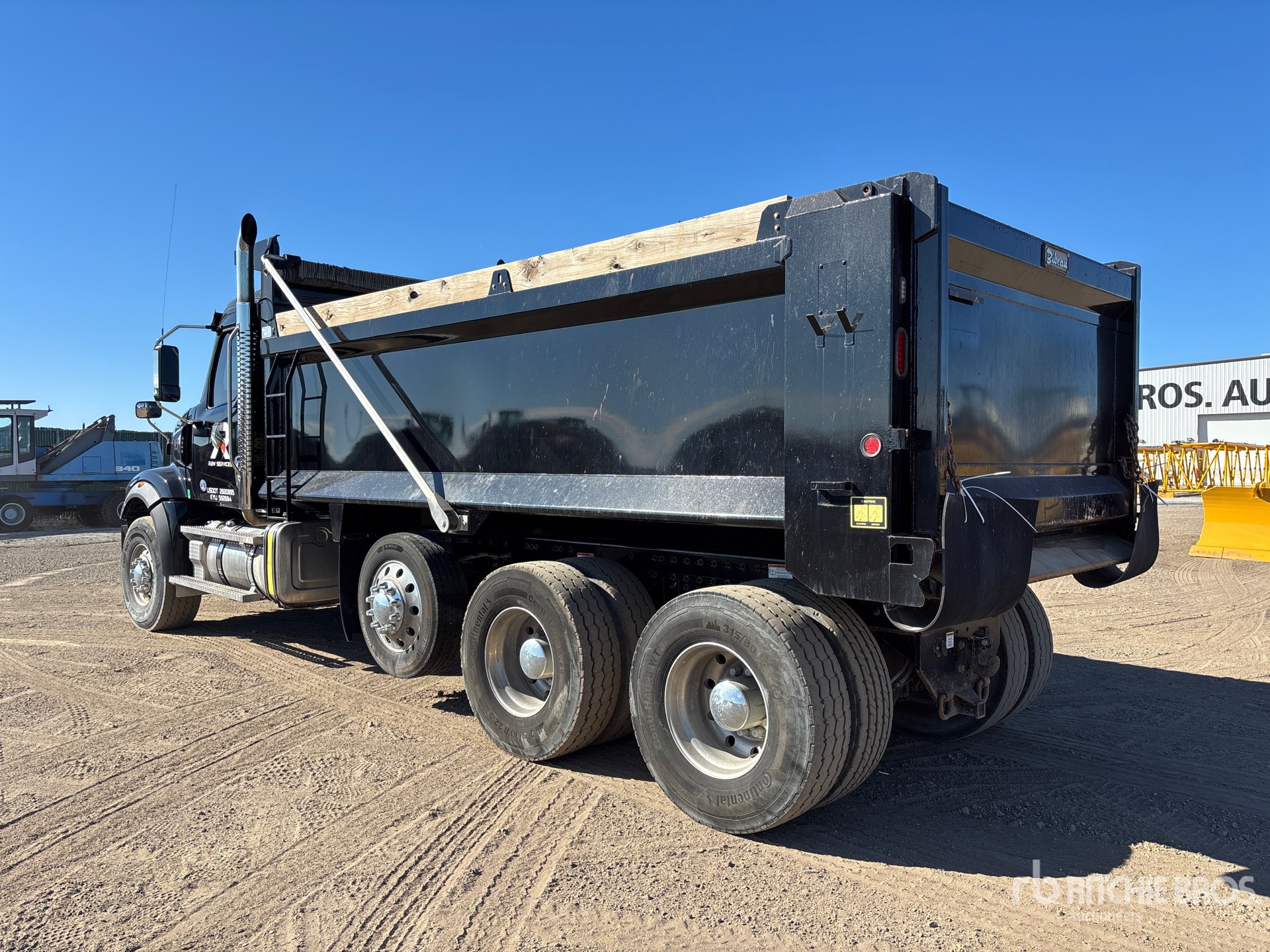 Detroit DD16 6 Cylinder 15.6 L Diesel 600 hp Engine, Requires Diesel Exhaust Fluid, 1144 Engine hrs, Engine Brake, Detroit DT12-2050-OV 12-Speed Automated Transmission, 20000 lb Front Axle, 59000 lb Rears, Meritor RT-46-160 Drive Axles, 3.42:1 Axle Ratio, 79300 lb GVWR, Air Ride Cab, Aluminum Wheels, 425/65R22.5 Front Tires, 315/80R22.5 Rear Tires, Steerable Air Lift Pusher Axle, Dual Steering Boxes, Rubber over Walking Beam Suspension, 250 in Wheelbase, Bibeau 18 ft Long x 4 ft 6 in High Steel Body, Electric Roll Tarp, Pintle Hitch
