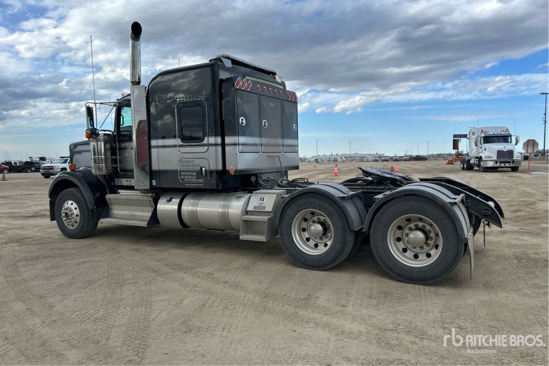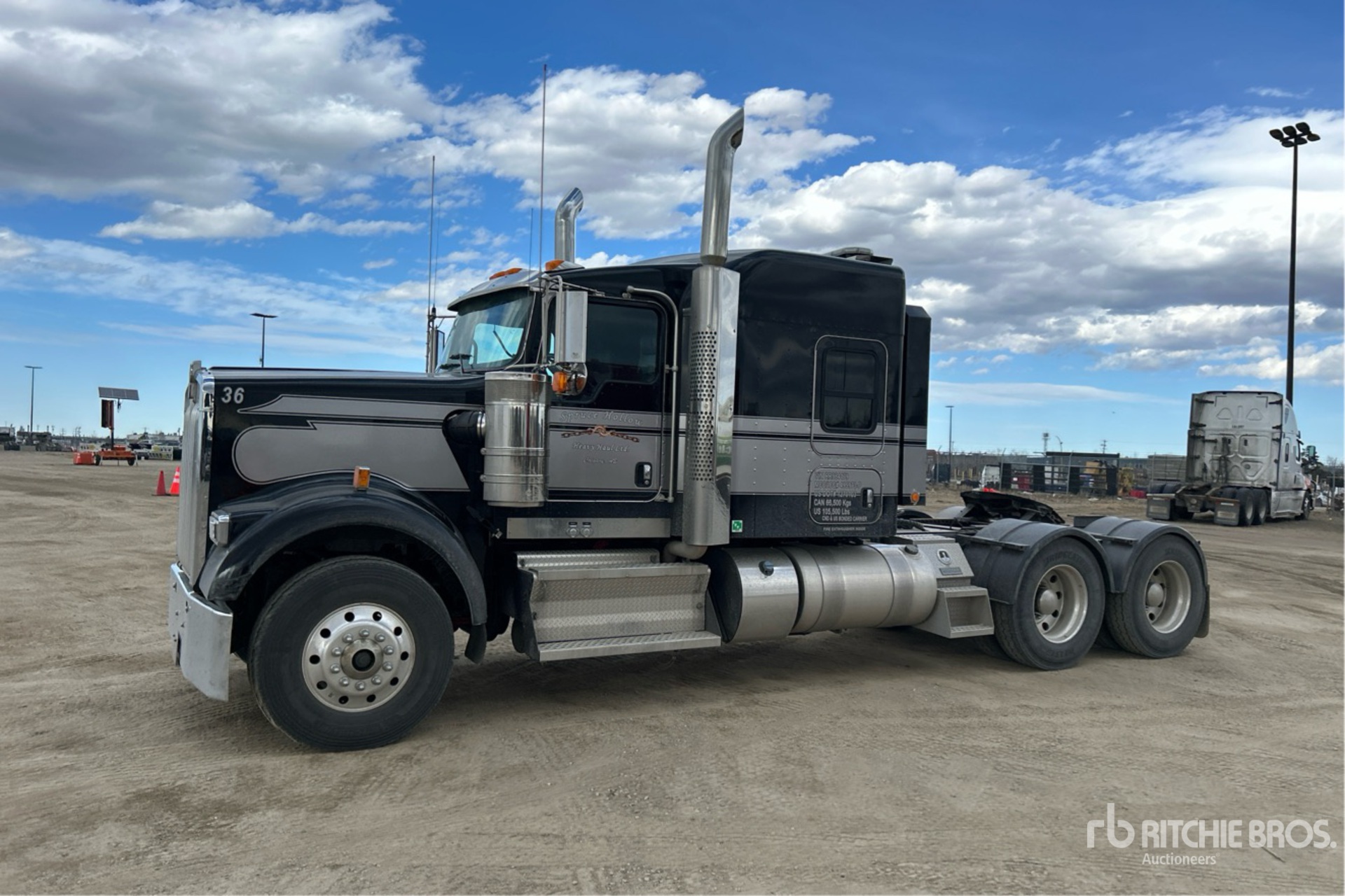 Cummins X15 565 hp Engine, 2023 US EPA Label, 3919 Engine hrs, Eaton Fuller RTLO-20918B 18-Speed Manual, 13200 lb Front Axle, Meritor RT-46-160 Drive Axles, 4.1:1 Axle Ratio, 46000 lb Rears, 59200 lb GVWR, Engine Brake, Double Differential Locks, 72 in Flat Top Sleeper Cab, 244 in Wheelbase, Air Suspension, Aluminum Wheels, 315/80R22.5 Front Tires, 11R24.5 Rear Tires, Air Sliding 5th Wheel, Dual Fuel Tanks, Headache Rack, Lowboy Ramps, 2050 Engine Torque , equipped with Samsara ELT, Complete-Dispersal-Spruce-Hollow-Heavy-Haul-Ltd