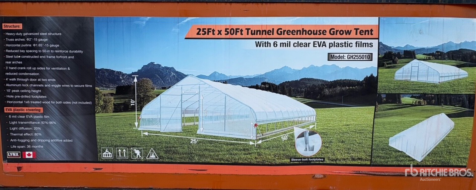 10' peak ceiling height -Six mil greenhouse grade plastic -Strong and durable galvanized piping structure with -4 foot man door, -Roll up sides for cross ventilation -Weight; 1750 lbs