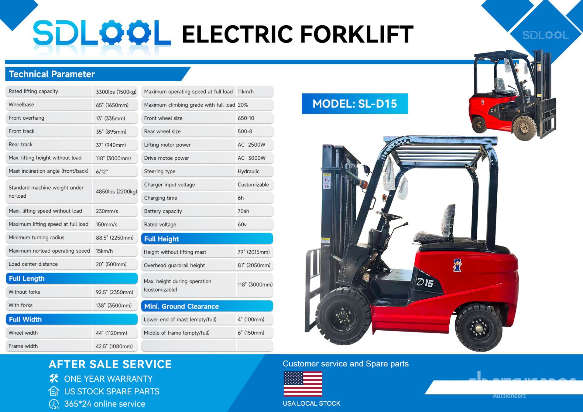 118 in Max Lift Height, 45 in Forks, 60 V, Product images displayed are stock photos. Item is new/unused.
