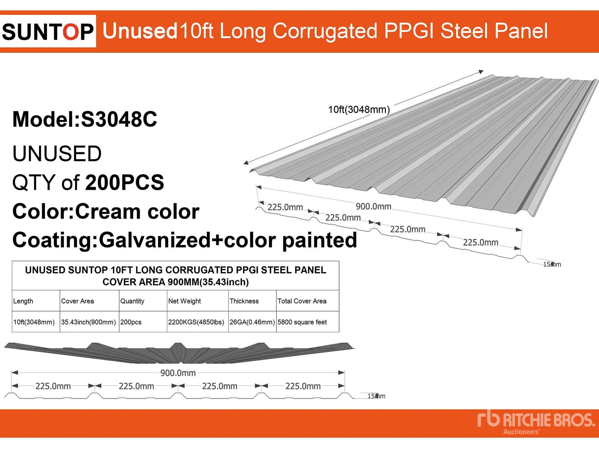 Quantity of (200) 2026 SUNTOP S3048C 35 in x 10 ft Corrugated PPGI Steel Panels (Unused)