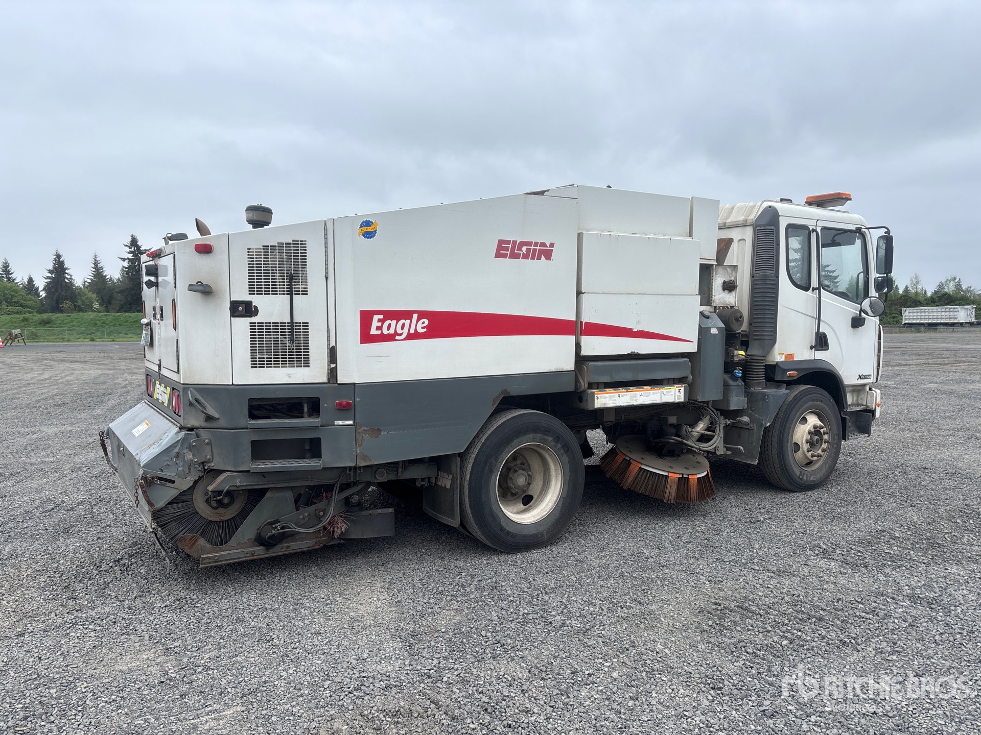 Cummins 6 Cylinder Diesel Engine, Requires Diesel Exhaust Fluid, Allison 2500 Automatic Transmission, 12000 lb Front Axle, 21000 lb Rears, 33000 lb GVWR, 11R22.5, Air Ride Suspension, 134 in Wheelbase, John Deere Auxiliary Engine, Mechanical Broom Sweeper, Dual Controls, 60 in Rear Broom, Gutter Brooms, Water System, Hopper Liner