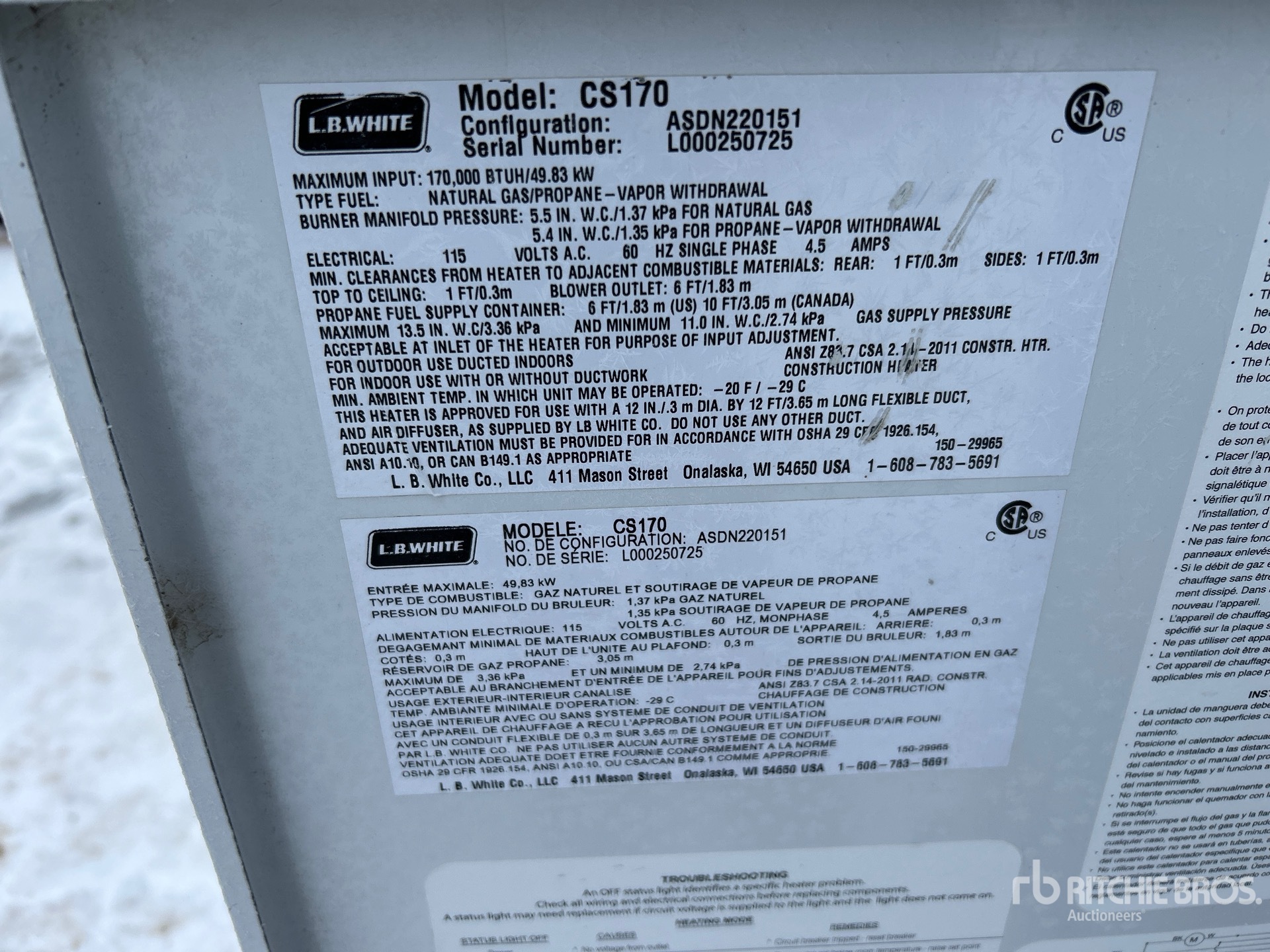 The detailed equipment information is limited in scope, and Ritchie Bros. Auctioneers has not inspected any aspects or components of the equipment other than those expressly set forth herein. Unless expressly stated, we make no representations or warranties, express or implied, concerning the equipment or its components, including without limitation any representations or warranties concerning functionality, conformity or compliance with any safety standard or requirement of any applicable authority or regulatory body, fitness for any particular purpose, or merchantability. You are strongly advised to perform your own detailed inspection of the equipment prior to bidding.