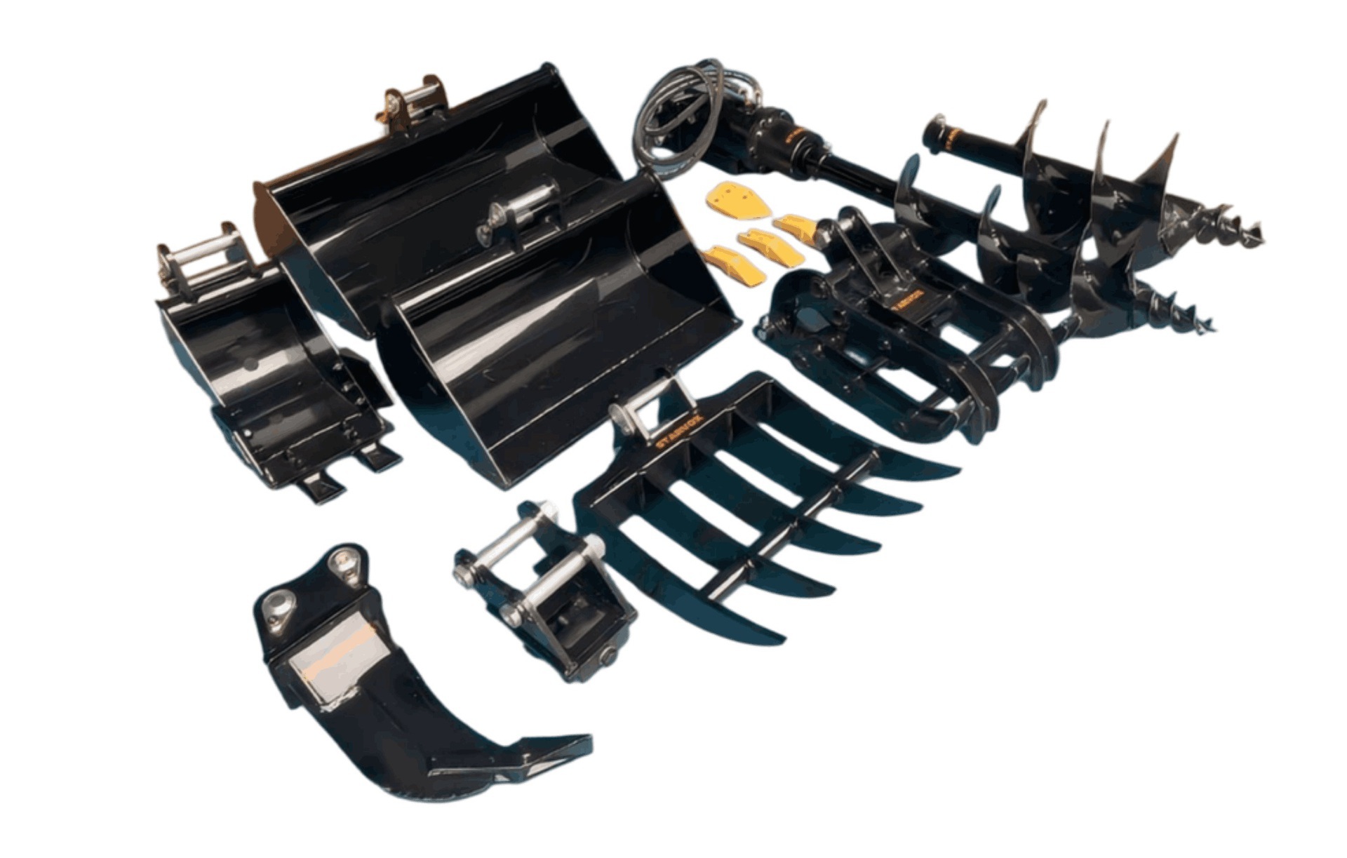 (1) 8 in Digging Bucket, (1) 24 in Cleanup Bucket, (1) 32 in Cleanup Bucket, (1) 8 in Auger, (1) 12 in Auger, (1) Quick Coupler, (1) Rake, (1) Ripper, (1) Grapple, (1) Set of Bucket Teeth & Side Cutters